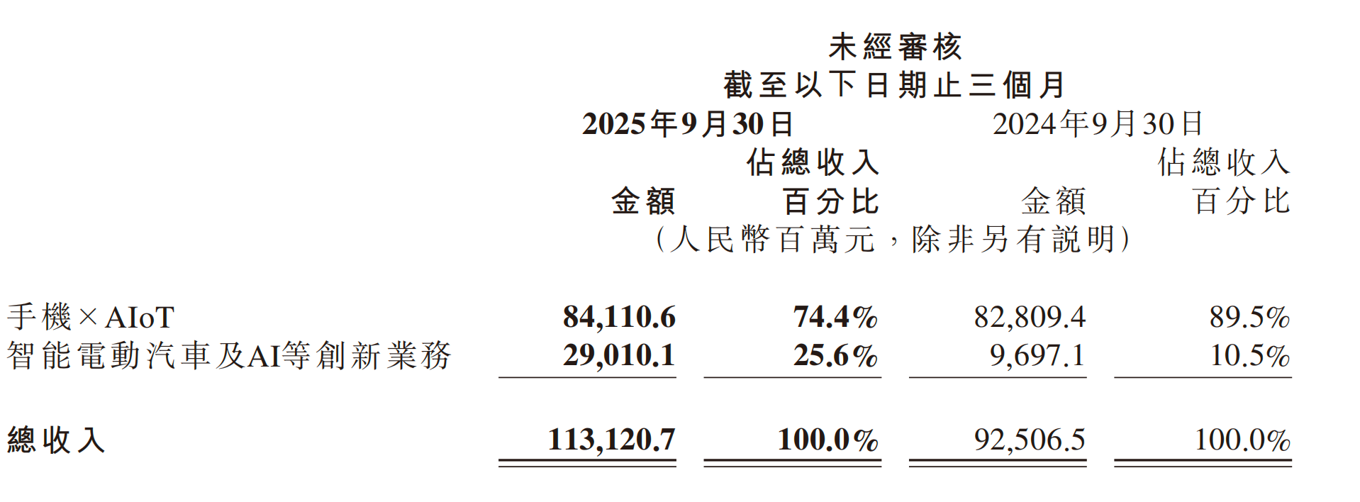 Core Insights - Xiaomi Group reported Q3 2025 revenue of 113.12 billion yuan, a year-on-year increase of 22.3%, and an adjusted net profit of 11.31 billion yuan, up 80.9% [2] - The smartphone and AIoT segment generated revenue of 84.11 billion yuan, a 1.6% increase, accounting for 74.4% of total revenue, while the innovative business segment, including smart electric vehicles and AI, saw revenue of 29.01 billion yuan, a 199.2% increase, making up 25.6% of total revenue [2] - Smartphone revenue decreased by 3.1% year-on-year to 46 billion yuan, primarily due to a 3.6% drop in average selling price (ASP) from 1,102.2 yuan to 1,062.8 yuan, despite a slight increase in shipment volume [2] Business Segment Analysis - The smartphone segment's shipment volume increased by 0.5% year-on-year to 43.3 million units, driven by growth in overseas markets [2] - The global memory market has experienced significant price increases across all categories since 2025, affecting the smartphone industry due to high storage costs [2][3] - The current memory price cycle is driven by AI-related high-performance computing (HPC) demand, leading to prolonged and substantial price increases, with expectations for further increases in Q4 [3] Market Dynamics - The memory price increases are expected to impact industry costs and gross margins, particularly for products with high storage cost components like smartphones, tablets, and laptops [3] - Xiaomi's president indicated that if retail prices for smartphones rise, the overall smartphone market will likely decline, although quantifying the exact impact is challenging [3] - The domestic smartphone market remains unsettled, with the current memory price increases intensifying competition among manufacturers, testing their financial strength and supply chain influence [4]