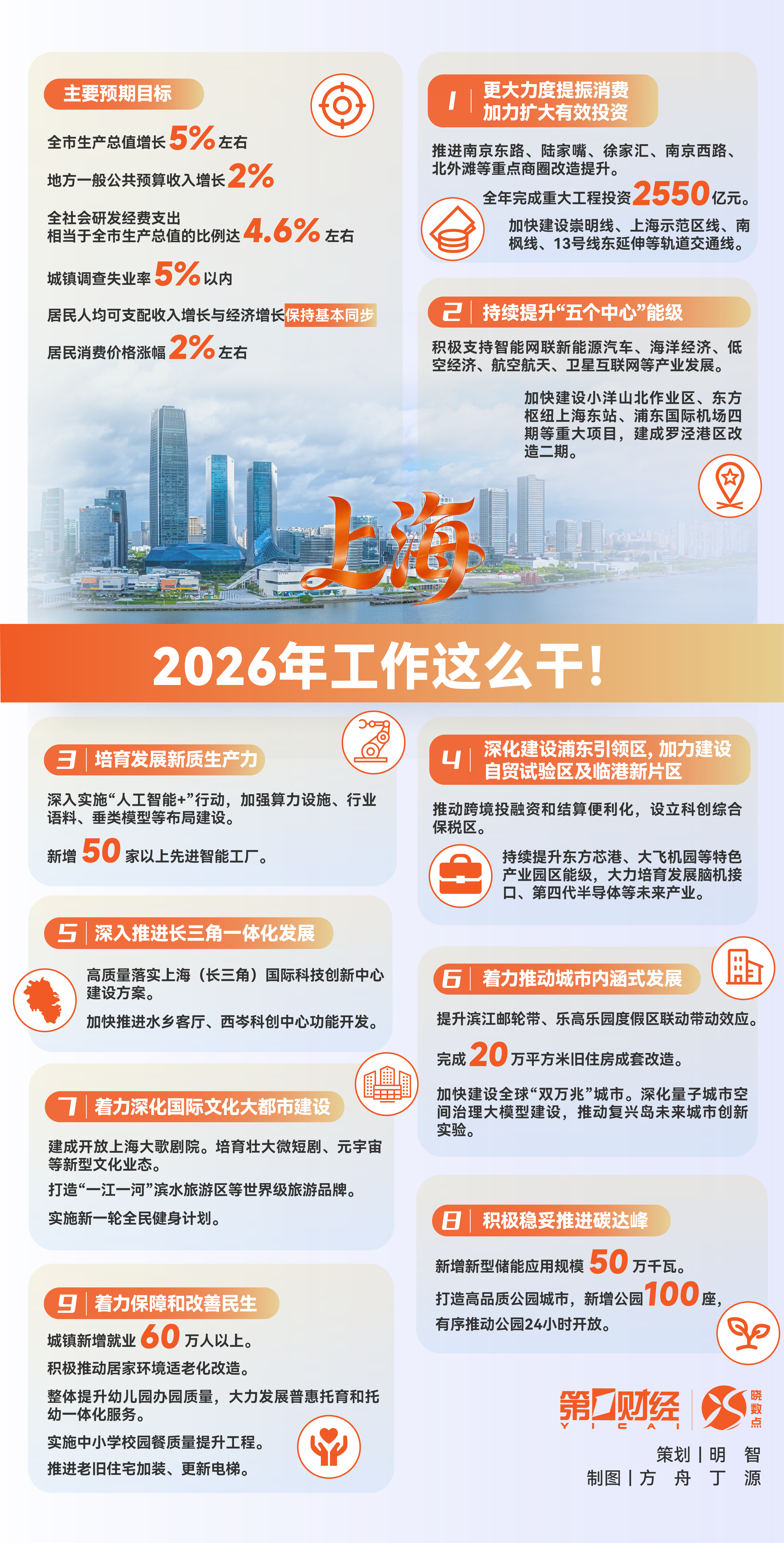 一图速览>> 高质量落实上海 建设方案。 加快推进水乡客厅 居民人均可支配收入增长 ● 居民消费价格涨幅 2 深入实施"人工智能+"行 语料、垂类模型等布局延 50 家以上先进行 新增 培育发展新质 T 深入推进长三 着力深化国际 建成开放上海大歌剧院。 等新型文化业态。 打造"一江一河"滨水旅》 实施新一轮全民健身计找 旦 | 着力保障和改 城镇新增就业 60 万. 积极推动居家环境适老4 整体提升幼儿园办园质量 幼一体化服务。 实施中小学校园餐质量拨 推进老旧住宅加装、更亲 ...