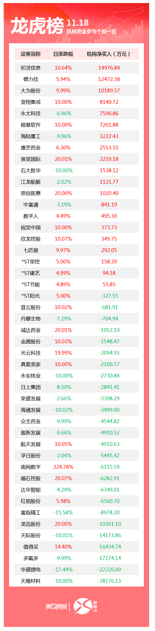 | 18 序 | E 11.18 | | | --- | --- | --- | | | 机构资金参与个股一 | | | 证券简称 | ■涨跌幅 | 机构净买入(万元) | | 初灵信息 | 10.64% | 14976.84 | | 德力佳 | 5.94% | 12472.38 | | 大为股份 | 9.99% | 10189.57 | | 亚翔集成 | 10.00% | 8140.72 | | 永太科技 | -6.96% | 7596.86 | | 榕基软件 | 10.00% | 7261.88 | | 海陆重工 | -9.96% | 3222.43 | | 康芝药业 | 6.30% | 2553.51 | | 富亚国际 | 20.01% | 2210.18 | | 石大胜华 | -10.00% | 1538.12 | | 江龙船艇 | -2.02% | 1121.77 | | 思创医惠 | 20.00% | 1020.40 | | 中富通 | -3.19% | 841.19 | | 数字人 | 4.49% | 495.30 | | 视觉中国 | 10.00% | 373.73 | | 欣龙控股 | 10 ...