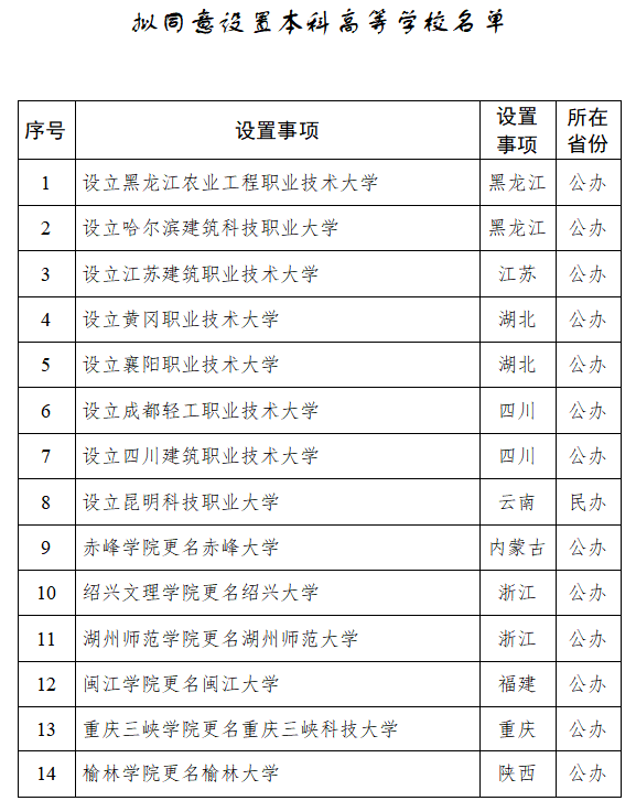 1月12日,教育部发布《关于拟同意设置本科高等学校的公示》。根据《中华人民共和国高等教育法》 《普通高等学校设置暂行条例》《普通本科学校设置暂行规定》《本科层次职业学校设置标准(试 行)》等有关规定,经教育部党组会议审议,拟同意设置黑龙江农业工程职业技术大学等14所学校,现 予公示。公示时间为2026年1月12日至1月16日。 拟同意设置的14所本科高等学校名单中,8所为职业本科,6所为学院更名大学。 8所新设职业本科院校分别为黑龙江农业工程职业技术大学、哈尔滨建筑科技职业大学、江苏建筑职业 技术大学、黄冈职业技术大学、襄阳职业技术大学、成都轻工职业技术大学、四川建筑职业技术大学、 昆明科技职业大学。 拟同意设置的14所本科高等学校名单中,8所为职业本科。 1月4日,教育部发展规划司发布《关于拟同意设置本科高等学校的公示》,拟同意设置天津职业大学等 15所学校,其中7所为职业本科院校。 加上本次拟新增的8所职业本科院校,目前我国职业本科院校已超过100所,将达到102所。 既有学历又有技能,职业本科学校也受到不少家长和学生的青睐。与此同时,一些职业本科院校的录取 分数线也水涨船高。从2025年的高考分数线看, ...