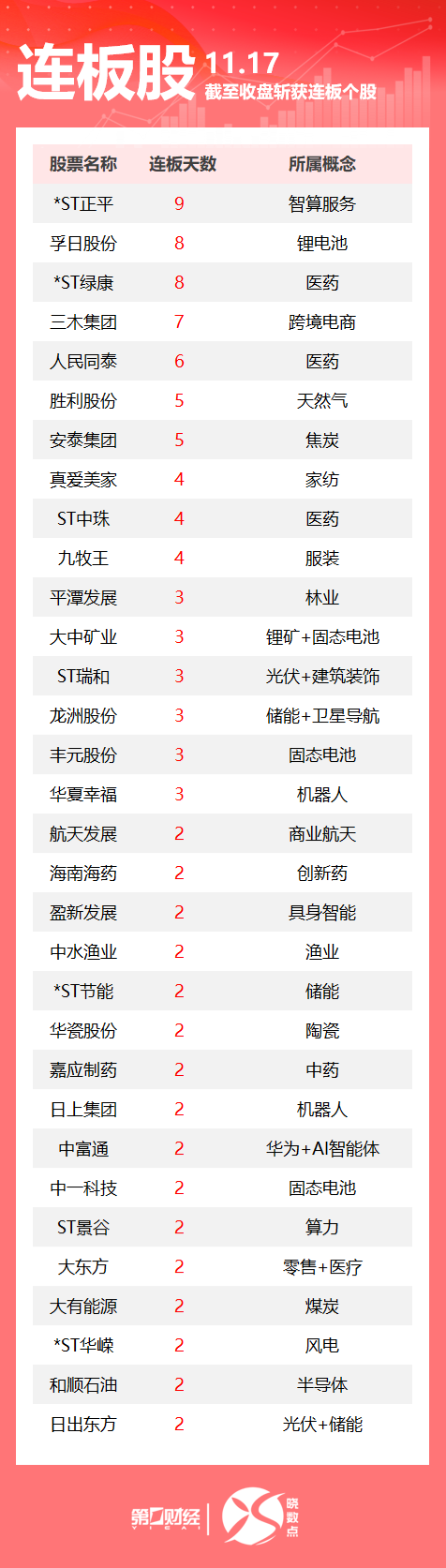 | 盈新发展 | 2 | 具身智能 | | --- | --- | --- | | 中水渔业 | 2 | 三田 | | *ST节能 | 2 | 储能 | | 华瓷股份 | 2 | 陶瓷 | | 嘉应制药 | 2 | 中药 | | 日上集团 | 2 | 机器人 | | 中富通 | 2 | 华为+Al智能体 | | 中一科技 | 2 | 固态电池 | | ST景谷 | 2 | 算力 | | 大东方 | 2 | 零售+医疗 | | 大有能源 | 2 | 煤炭 | | *ST华峡 | 2 | 风电 | | 和顺石油 | 2 | 半島体 | | 日出东方 | 2 | 光伏+储能 | 11月17日,Wind数据显示,A股市场共计100只个股涨停。其中锂电股孚日股份收获8连板,跨境电商板 块三木集团7连板。一图速览今日连板股>> 第□财经 | 跨境电商板块三木集团7连板。一图速览今日连板股>> | | 连板股 11.17 一板股股 11.17 | | | --- | --- | --- | | 股票名称 | 连板天数 | 所属概念 | | *ST正平 | 9 | 智算服务 | | 孚日股份 | 8 | 锂电池 | | *S ...