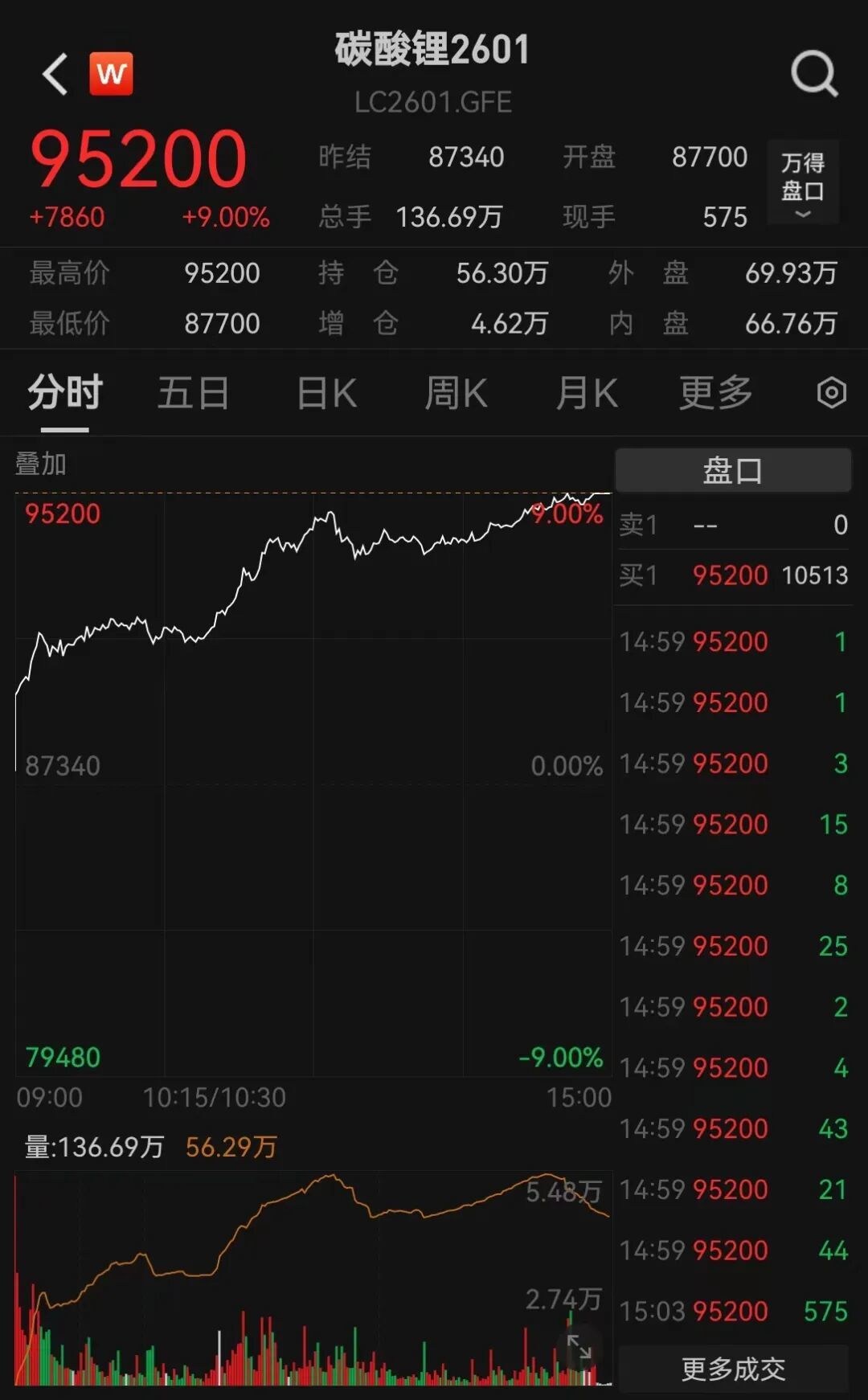 | < W | 碳酸锂2601 | | | | | --- | --- | --- | --- | --- | | | LC2601.GFE | | | | | 95200 | 昨结 87340 开盘 | | | 87700 万得 | | +7860 +9.00% | 总手 136.69万 现手 | | | 盘口 575 | | 最高价 95200 | 持 仓 56.30万 | | 外 雷 | 69.93万 | | 最低价 87700 | 僧 仓 | 4.62万 | R 型 | 66.76万 | | 分时 五日 | 日K 周K 月K | | | 更多 | | 叠加 | | | | 盘口 | | 95200 | 9:00% 卖1 | | | 0 | | | | | ने 1 | 95200 10513 | | | | | 14:59 95200 14:59 95200 | T T | | 87340 | | | 0.00% 14:59 95200 | 3 | | | | | 14:59 95200 | 15 | | | | | 14:59 95200 | 8 | | | | | 14:59 95200 | 25 ...