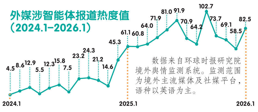 智能体是能够感知环境、自主规划、决策并执行任务的AI应用系统,2025年被业内视为"AI智能体元年"。环球时报研究院舆情监测团队对外媒与国 外社交媒体2024年1月-2026年1月关于智能体报道的热度进行了舆情监测,其间外媒与国外社交媒体对智能体的关注度呈现出总体走高的态势。 所谓"端侧智能体",是指搭载在终端设备(如手机、电脑、IoT设备等)上能够独立完成推理、决策、任务执行的智能体。中国信息通信研究院人工 智能研究所副所长巫彤宁表示,智能体被视为人工智能从感知理解(会说话)向主动服务(会做事)演进的关键形态。 上海交通大学人工智能学院副教授、无问芯穹联合创始人兼首席科学家戴国浩在研讨会上介绍说,AI的终极目标是服务于物理世界中的人。因此智 能必须通过我们身边的终端设备(如手机、汽车、机器人)来实现,这就是"端侧智能"。在端侧如何构建人机交互与处理的"语言",衍生出不同技 术路线。 据专家介绍,第一种是GUI(图形用户界面)路线,靠视觉识别读取屏幕信息后进行"模拟操作"。戴国浩形容,"这好比另有一人通过观察界面来操 作用户设备,它将物理世界的信息——如视觉、听觉等——转化为AI可理解的表达方式"。GUI的优 ...