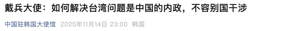 戴兵大使:如何解决台湾问题是中国的内政,不容别国干涉 11月13日,戴兵大使同30多家中韩主流媒体记者座谈时,有韩国记者问及如何看待"韩美同盟现代化"可能涉及遏华甚至介入台海事态。 戴兵表示,韩美同盟是历史形成的,其定位大家都很清楚。中方及地区国家都关注所谓"韩美同盟现代化"。如果韩美同盟的战略目标发生变化,中方对其 态度也将随之改变。一个中国原则是中国同各国建交和发展关系的政治基础,也是各国对中国作出的政治承诺。如何解决台湾回归祖国、实现国家统一问 题,是中国的内政,不容别国干涉。国家尚未统一,这是中国人民心中的痛。任何国家、任何人在中国人民的痛处捅刀子,中方必然作出强烈反应。近日 日本新首相涉台错误言论完全不可接受,中方已表明严正立场。希望韩美同盟不要在台湾问题上玩火。 来源:中国驻韩国大使馆编辑:孟媛校对:张丽媛审核:张晓雅 ...