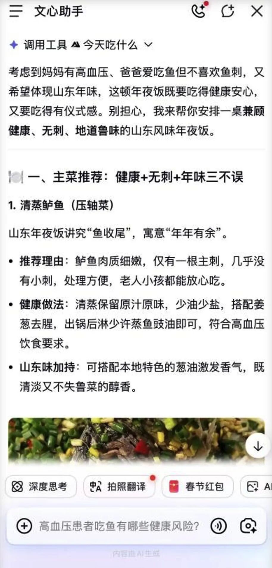 今天上班第一天,你还在回味春节年夜饭的滋味吗? 盘点这个春节的最潮打开方式,有人发现,在AI助手的加持下,年夜饭不再"众口难调"了。当科技融入中国年的烟火气,有多少人的春节筹备因为AI这个 新帮手,变得高效又暖心,也让传统年味在智能加持下,多了几分贴心与新意。 春节前期,远在北京的小鱼正和山东潍坊老家的妈妈视频筹备年夜饭,这道每年必做的"功课",今年因"文心"变得轻松不少。妈妈有高血压需低盐低脂饮 食,爸爸爱吃鱼却怕刺,想做几道有吉祥寓意的新菜,又担心操作复杂,这些春节筹备的常见难题,成了不少人过年的小困扰,而"文心"的深度搜索功 能,恰好能精准解决这类个性化需求。 打开百度APP,找到底部中心的文心对话框,只需语音输入具体需求,就能快速获取定制化方案。 小鱼对着麦克风说出诉求:"帮我设计一份适合一家三口的年夜饭菜单,妈妈高血压要低盐低脂,爸爸喜欢吃鱼且怕刺,需要有吉祥寓意,步骤简单好操 作。" (图:百度文心生成 短短十秒,文心就生成了一份兼顾健康、口味与年味的鲁味年夜饭详细方案,不仅标注了每道菜的营养成分、吉祥寓意,还附带了具体的制作步骤和食材 用量。 针对小鱼家人的情况,方案里的主菜清蒸鲈鱼堪称"量身定 ...