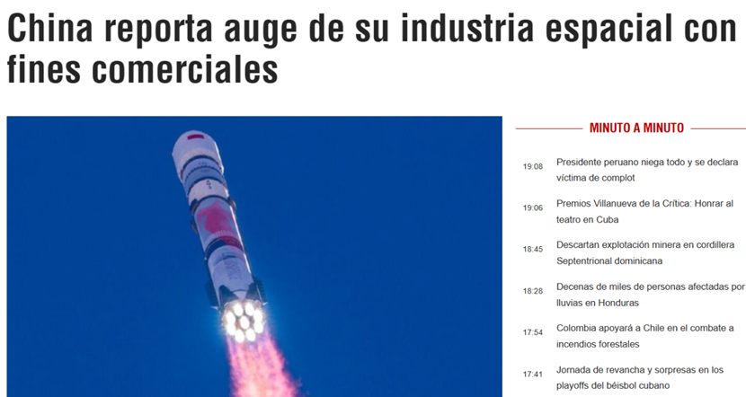 《联合早报》报道称,2025年中国商业航天保持快速发展,全年完成发射50次,占比中国全年宇航发射总数54%。其 中,商业运载火箭发射25次。此外,全年入轨商业卫星311颗,占比中国全年入轨卫星总数84%。 | 80:61 | Presidente peruano niega todo y se declara | | --- | --- | | | víctima de complot | | 9:06 | Premios Villanueva de la Crítica: Honrar al | | | teatro en Cuba | | 8:45 | Descartan explotación minera en cordillera | | | Septentrional dominicana | | 8:28 | Decenas de miles de personas afectadas por | | | lluvias en Honduras | | 7:54 | Colombia apoyará a Chile en el combate a | | | incendios forestal ...