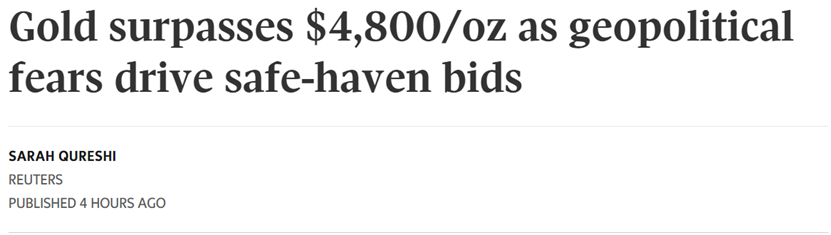 黄金价格首次突破每盎司4800美元,波动性可能加大