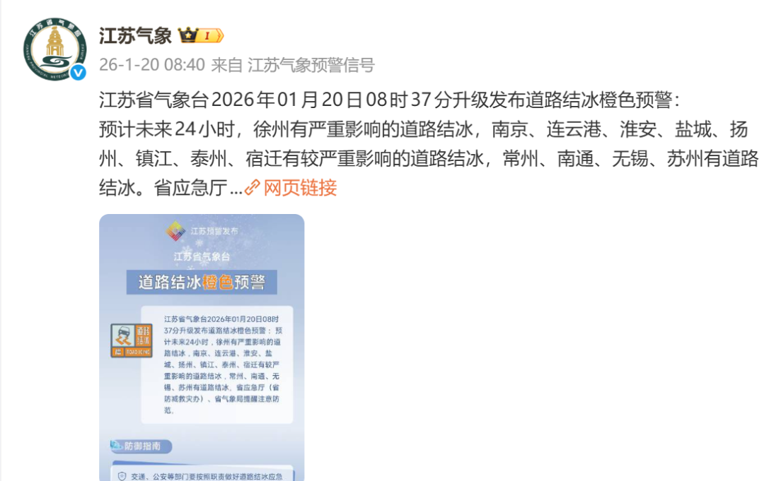 江苏省气象台 2026年01月20日08时37分 升级发布道路结冰橙色预警 预计未来24小时,徐州有严重影响的道路结冰,南京、连云港、淮安、盐城、扬州、镇江、泰州、宿迁有较严重影响的道路结冰,常州、南通、无锡、苏 州有道路结冰。 来源:江苏新闻 江苏广电荔枝新闻中心记者从江苏省气象台获悉:19日1:00开始到今晨6:00,全省13个市先后都出现降雪。 徐州市区、沛县、丰县、睢宁、宿迁泗洪、淮安的洪泽6个区县累计达到暴雪量级,徐州、连云港、宿迁、淮安、盐城和扬州等市19个区县达大雪量级。 降雪量前三分别是:徐州的丰县16.1毫米,沛县13.6毫米,宿迁泗洪12.2毫米。都达到暴雪量级。 同时,全省49个区县有积雪,积雪深度前三分别是:徐州丰县13厘米,徐州市区12厘米,邳州11厘米。 南京降雪最大区域在浦口4.1毫米、六合3.6毫米,均达到中雪量级。 南京路况 截至发稿时,南京全市国省干线通行正常。 目前降雪正集中在南京扬州泰州沿江一带,南京的雪目前还是处于比较强的态势,根据它的演变来看10点左右会逐渐地减小,11点以后基本上结束了。 苏南地区:苏州无锡的雪可能也在8-9点开始增强,但是目前来看苏州无锡东南部的 ...