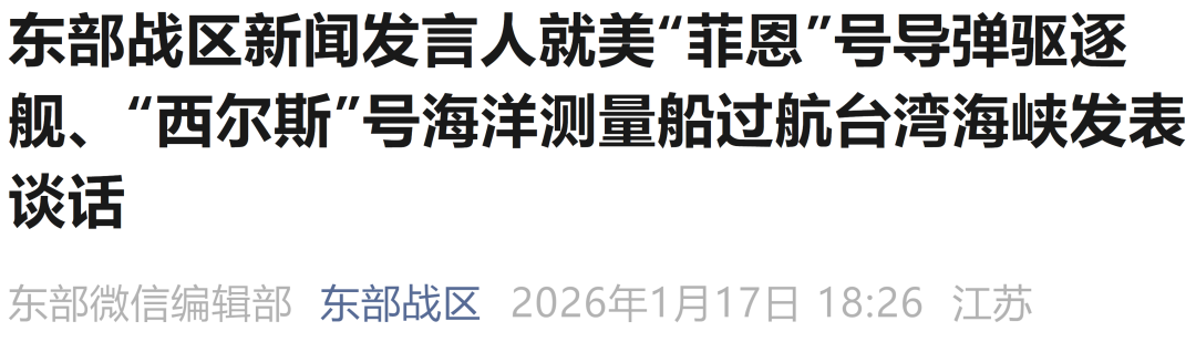 来源:东部战区 编辑:施 予 校对:赵钰阳 审核:张晓雅 东部战区新闻发言人就美"菲恩"号导弹驱逐舰、"西尔斯"号海洋测量船过航台湾海峡发表谈话 东部战区新闻发言人徐承华陆军大校表示,1月16日至17日,美"菲恩"号导弹驱逐舰、"西尔斯"号海洋测量船过航台湾海峡。中国人民解放军东部战区组 织海空兵力对美舰过航行动全程跟监警戒,有效应对处置。战区部队时刻保持高度戒备,坚决捍卫国家主权安全和地区和平稳定。 ...