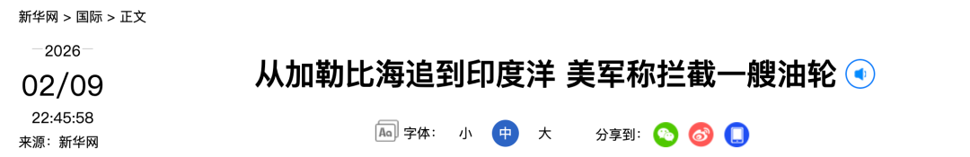 从加勒比海追到印度洋,美军称拦截一艘油轮 美国国防部9日在社交媒体上发布消息称,美军在印度洋拦截一艘油轮并登船检查。 消息说,这艘名为"阿奎拉II"号的油轮"违反了美国总统特朗普在加勒比海地区对受制裁船只实施的隔离禁令",美方发现后从加勒比海一直追踪至印度 洋。 据一家船舶追踪与数据分析网站消息,"阿奎拉II"号是一艘悬挂巴拿马国旗的油轮。 2025年12月,特朗普下令对所有进出委内瑞拉的受美国制裁油轮实施"全面彻底的封锁"。 来源:新华社 编辑:朱嘉琪 校对:张丽媛 审核:苏 芳 ...