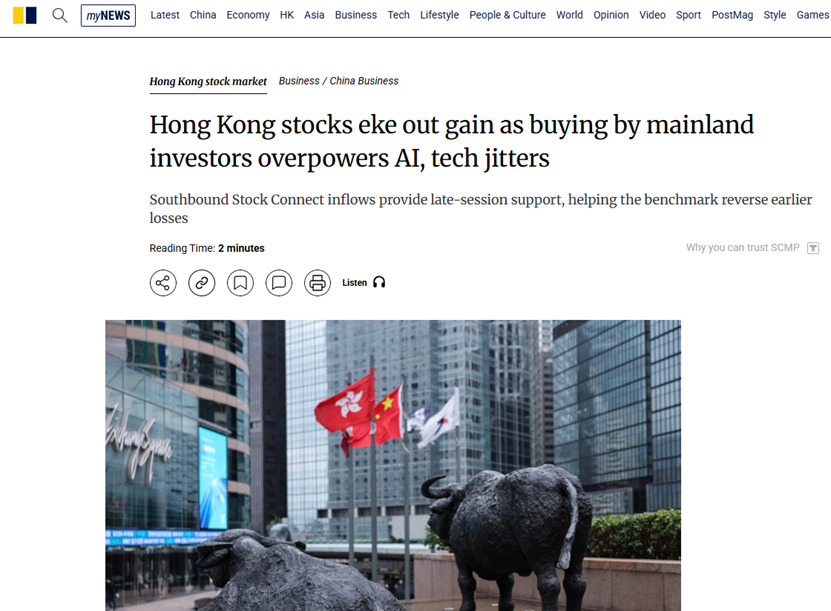 【环球网财经综合报道】尽管上周港股市场出现一定波动,但南向资金持续加码港股市场的热度依然不减。Wind数据 显示,截至2月8日,南向资金已连续7个交易日保持净流入。其中,最近三个交易日,南向资金成交净买入金额均破 百亿元,2月6日南向资金成交净买入金额甚至创近期新高至222.06亿元。 《南华早报》发文称,南向资金汹涌流入市场,抵消了科技股因估值过高,以及对人工智能担忧而出现的下跌。 但也需要关注到,有分析人士认为,互联网巨头旗下人工智能(AI)应用相继推出大额红包活动,或引发投资者对竞 争加剧的担忧,也是近期市场焦点。 Federated Hermes 的股票投资总监 Charlotte Daughtrey 称:"最近的科技公司财报以及市场的反应表明,我们正进入人 工智能周期的更审慎阶段,投资者不再将与人工智能相关的资本支出视为自动正面因素,而越来越关注这些支出是否 转化为可衡量的收入增长和可靠的回报路径,同时保持盈利。" 此外,港股IPO市场2026年以来仍延续热度。Wind数据显示,截至2月8日,年内港股IPO新增18家,较去年同期增长 125%;首发募资额为675.5亿港元,较去年同期上升1029.2 ...