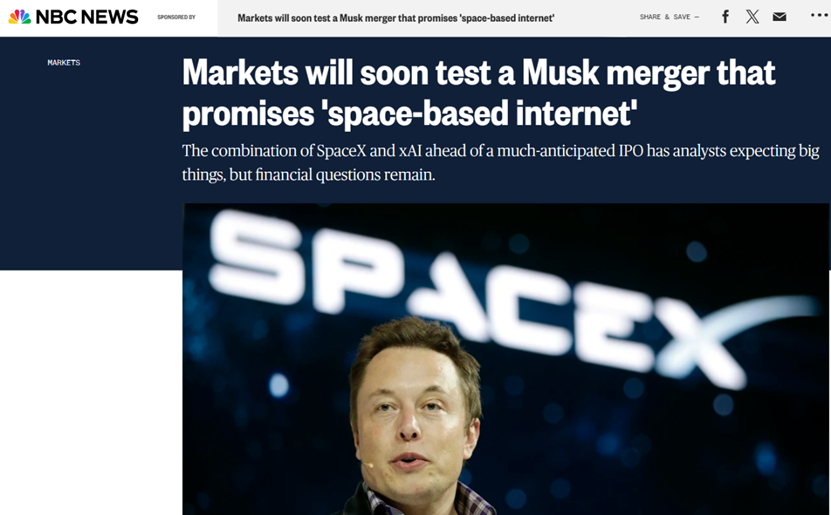 【环球网财经综合报道】日前,埃隆·马斯克将SpaceX和xAI合并,创建了截至目前全球最大的私人公司之一,有分析 人士称,此举在向公众市场迈进的过程中,既有潜力增长,也存在财务风险。 NBCNEWS发文称,Zacks Investment Research的股票策略师安德鲁·罗科在接受电话采访时认为,此次收购是有意义 的:"这将产生大量的协同效应,这两家公司会更顺利地运营。"他还提到:"SpaceX凭借其庞大的载荷容量和几乎垄 断的太空市场,我认为这将帮助马斯克的其他公司加快在人工智能数据中心和训练竞赛中的步伐。" Bloomberg则报道称,合并后的公司估值将达到1.25万亿美元,其中大部分估值来自SpaceX。 马斯克则在公告中表示:"在未来两到三年内,太空可能是生成式人工智能计算成本最低的方式"。 此外,马斯克认为,今年年内或实现AI对人类能力的全面数字化模拟,这将彻底改变许多行业,未来"仿真数字人 类"将远超人类数量。在此背景下,控制AI不是重点,当务之急是确保其价值观与人类文明延续目标一致。 ...