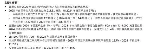Core Insights - Hong Kong Stock Exchange (HKEX) reported record high total revenue and net profit for the first three quarters of 2025, with total revenue reaching HKD 21.851 billion, a 37% year-on-year increase, and net profit of HKD 13.419 billion, up 45% [1][3] Revenue and Profit Growth - The significant growth in HKEX's performance is attributed to increased market trading activity and a surge in new stock listings, with major business revenue rising by 41% year-on-year [3][4] - In Q3 alone, HKEX achieved a revenue of HKD 7.775 billion, marking a 45% increase, and a net profit of HKD 4.9 billion, which is a 56% rise compared to the previous year [1][3] Trading Activity - The average daily trading volume for the first three quarters reached HKD 256.4 billion, a remarkable 126% increase year-on-year, driving significant growth in trading and settlement fees [3][4] - Stock trading fee revenue amounted to HKD 4.193 billion, more than double that of the same period last year [3] Stock Connect Performance - The Stock Connect mechanism showed strong performance, with average daily trading volumes for Shanghai-Hong Kong Stock Connect and Shenzhen-Hong Kong Stock Connect reaching RMB 206.4 billion and HKD 125.9 billion, respectively, representing year-on-year increases of 67% and 229% [3][4] - Total revenue from Stock Connect rose to HKD 3.225 billion, an 81.18% increase year-on-year [3] New Listings and Capital Raising - The new stock market has become a crucial driver of HKEX's growth, with 297 new stock listing applications processed by the end of Q3, more than triple the 84 applications at the end of 2024 [4] - HKEX led the global market in new stock fundraising, with a total of HKD 188.3 billion raised from 69 companies, over three times the amount raised in the same period last year [4] Strategic Initiatives - HKEX's CEO emphasized ongoing strategic reforms aimed at diversifying the market, enhancing liquidity, and strengthening global connectivity to solidify Hong Kong's status as an international financial center [4] - Industry experts express optimism about HKEX's future, highlighting its core trading business, Stock Connect mechanism, and strong performance in new stock fundraising as indicators of resilience and vitality in the international financial hub [4]