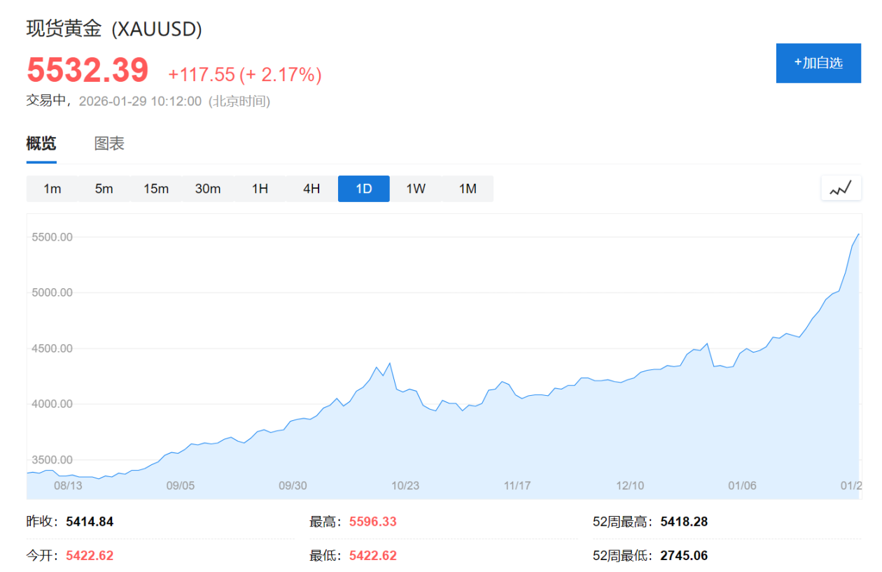 【环球网财经综合报道】1月29日,全球金融市场目光聚焦贵金属市场,现货黄金再度成为耀眼"明星"。当日,现货黄金日内最高报5595.41美元/盎司,涨幅 达3%,强势突破此前高点,续刷历史新高。与此同时,现货白银也不甘示弱,突破119美元/盎司,日内涨幅2%。 花旗集团设定了不同的情景预测。基准情景下(50%概率),随着关税担忧缓解和全球经济软着陆,金价可能在年内呈现"磨底"或中性震荡态势;但在牛市 情景下(30%概率),若美国陷入滞胀或美元指数因美联储激进降息大幅崩盘,金价将在2026年底稳步升至5000美元,并在2027年冲击6000美元。 德意志银行认为地缘政治和经济不确定性引发投资者向避险资产"恐慌性逃离",资金涌入黄金市场。同时,金银比的修复以及中国需求对贵金属板块的支 撑,将推动2026年黄金价格看至6000美元/盎司,替代情景下甚至可能触及6900美元/盎司。 法国兴业银行此前预测可能过于保守,该行分析师指出,当前黄金上涨由美联储降息预期、政策不确定性以及持续的投资需求三大因素共同驱动。只要这些 驱动力不发生根本性逆转,金价就没有理由停止上涨,并将年底目标价上调至6000美元。 货币政策也是影响黄 ...