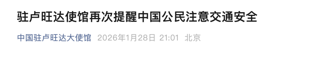 卢旺达报警求助电话:112 卢旺达交通事故求助电话:113或+250-788311110 中国驻卢旺达使馆再次提醒中国公民注意交通安全 近日,卢旺达发生一起严重交通事故,造成中国公民伤亡,教训十分惨痛。中国驻卢旺达大使馆再次提醒在卢中国公民增强交通安全意识,选择安全车 辆,切忌酒后驾驶、疲劳驾驶、超速驾驶,确保出行安全。卢道路交通状况复杂,自驾出行要提前规划行车路线,检查车况,携带有效证件,途中谨慎驾 驶、注意避让,明辨交通标识标线,严守当地交通法规。行人过马路要注意观察,以防被车辆冲撞,造成伤害。 如遇交通事故,请保持冷静,在确保自身安全的前提下及时拨打当地报警、急救电话,紧急情况下可联系拨打使馆领保电话寻求协助。 来源:中国驻卢旺达大使馆 编辑:朱嘉琪 校对:张丽媛 审核:张晓雅 2026年1月28日 驻卢使馆24小时领事保护与协助电话:+250-784825635 外交部全球领事保护与服务应急呼叫中心电话(24小时):+86-10-12308或+86-10-65612308 驻卢旺达使馆 ...