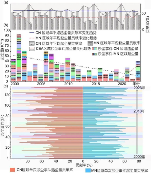 2000-2023 年东亚中部地区中国北方与蒙古国大规模沙尘事件起尘量及贡献率变化。受访单位供图 研究结果表明,21世纪初以来,大规模沙尘事件频率由每年约9次降至3次,起尘量年均减少约 0.173×106吨,区域整体沙尘活动显著减弱,但2020年至2023年事件次数增至年均5次,总起尘量由 5.70×106吨增至40.3×106吨,增长超过7倍。蒙古国的年均贡献率由21世纪初的43%上升至近年来的 53%,2022年达到年际峰值62%,在2023年4月的一次典型沙尘事件中达到64%,表明蒙古国南部戈壁沙 漠成为东亚中部大规模沙尘事件的主要起尘源区。 分析表明,风速对大规模沙尘事件起主导作用,贡献率46%,而植被覆盖度和土壤湿度对大规模沙 尘事件也分别起到一定作用,各占19%、9%。总体而言,自2020年以来,蒙古国南部风速增强、植被 退化与土壤湿度下降,是近期东亚沙尘事件频发和增强的主要原因。 东亚中部是世界重要的沙尘源区之一,大规模跨境沙尘事件不仅影响中国、蒙古国和日本等,还可 远至北美和欧洲。过去二十余年,我国沙尘活动总体呈下降趋势,但近年来频率和强度显著增加,引发 广泛关注。 中国科学院西北生态环境资源 ...