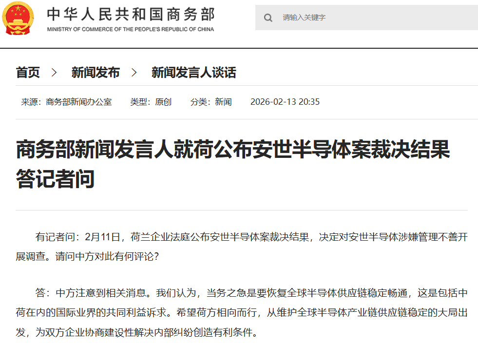 Core Viewpoint - The Chinese side emphasizes the importance of restoring stability in the global semiconductor supply chain, which is a common interest for the international industry, including both China and the Netherlands [1]. Group 1 - The Dutch court has announced a decision regarding Nexperia, indicating an investigation into the company's alleged mismanagement [1]. - The Chinese government hopes that the Dutch side will take steps to facilitate constructive negotiations between the companies involved to resolve internal disputes [1].