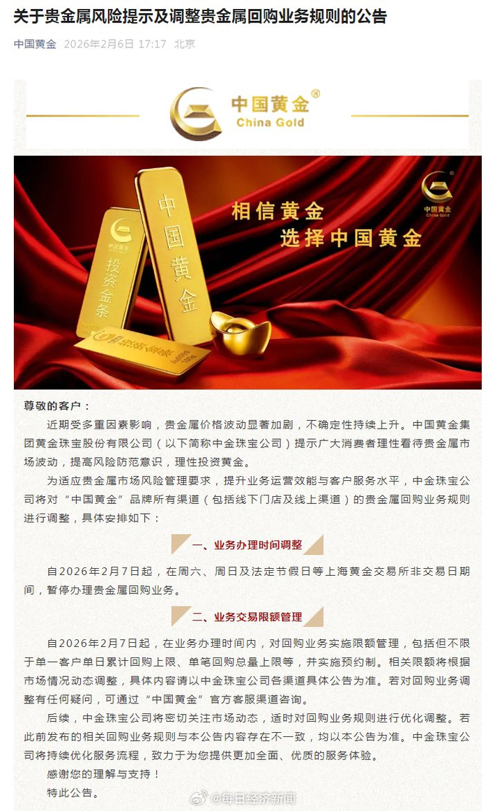 【#多家品牌金店节假日暂停办理回购#】2月6日,中国黄金集团黄金珠宝股份有限公司于微信公众 号"中国黄金"发布《关于贵金属风险提示及调整贵金属回购业务规则的公告》。 公告称,近期受多重因素影响,贵金属价格波动显著加剧,不确定性持续上升。中国黄金集团黄金珠宝 股份有限公司(以下简称中金珠宝公司)提示广大消费者理性看待贵金属市场波动,提高风险防范意 识,理性投资黄金。 为适应贵金属市场风险管理要求,提升业务运营效能与客户服务水平,中金珠宝公司将对"中国黄金"品 牌所有渠道(包括线下门店及线上渠道)的贵金属回购业务规则进行调整。自2026年2月7日起,在周 六、周日及法定节假日等上海黄金交易所非交易日期间,暂停办理贵金属回购业务。 同时,自2026年2月7日起,在业务办理时间内,对回购业务实施限额管理,包括但不限于单一客户单日 累计回购上限、单笔回购总量上限等,并实施预约制。 除中国黄金外,头部金店菜百股份也宣布调整贵金属回购业务。 菜百股份官微显示,自2026年2月6日起,在周六、周日及法定节假日等上海黄金交易所非交易日期间, 公司将暂停办理贵金属回购业务。在业务办理时间内,公司将对回购业务进行限额管理,限额类型 ...