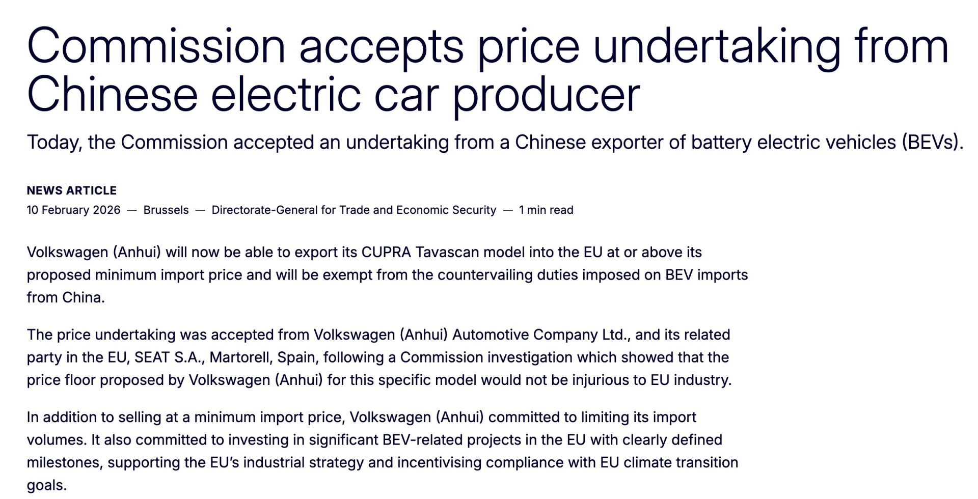 Core Viewpoint - The European Commission has accepted Volkswagen (Anhui) Co., Ltd.'s price commitment plan, allowing the CUPRA Tavascan model to be exempt from a previously applicable anti-subsidy tax of up to 20.7% by setting a minimum export price [1][3] Group 1: Price Commitment and Exemptions - Volkswagen's price commitment was proposed by Volkswagen and its EU affiliate, SEAT S.A., and was deemed not harmful to the EU industry [1] - The acceptance of the price commitment allows Volkswagen to sell the CUPRA Tavascan at a minimum import price, thus avoiding the anti-subsidy tax [3] Group 2: Investment and Strategic Goals - Volkswagen has also committed to limiting the quantity of exports to the EU and investing in significant projects related to pure electric vehicles within the EU [3] - These investments will have clear phased goals to support the EU industry strategy and align with EU climate transition objectives [3] Group 3: Context and Implications - This approval marks the first successful case since the framework consensus on the "price commitment" mechanism was reached between China and the EU on January 12 [6] - The EU has issued guidelines for Chinese electric vehicle exporters to utilize price commitments, which will replace anti-subsidy taxes for qualifying companies [6][7] - The guidelines specify that companies can submit proposals individually or jointly, set minimum import prices for specific models, and include annual export quantity commitments [7] Group 4: Challenges for Other Companies - The approval of Volkswagen's plan is closely tied to its investment commitments in the EU and the backing of local brands, which may pose challenges for other companies seeking similar approvals [8] - The complexity of product and distribution channels can affect the feasibility of proposals, with simpler submissions being more favorable for evaluation [8] - The ownership structure of companies may also influence the approval process, as Volkswagen Anhui is a joint venture with a 75% stake held by the German parent company [8]