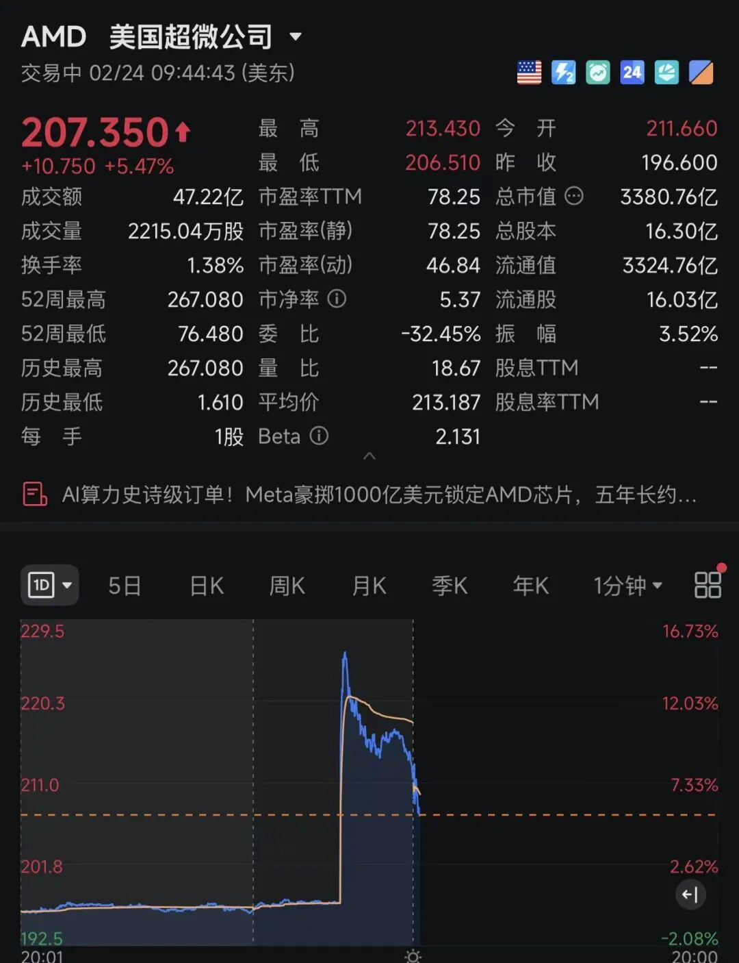 每经记者|张锦河 每经编辑|程鹏 记者|张锦河 编辑|程鹏 杜恒峰 校对|陈柯名 北京时间2月24日晚,美股三大指数小幅高开,纳指涨0.07%,道指涨0.01%,标普500指数涨0.01%。截至发稿,道指涨0.5%,纳指涨0.33%,标普500指数 涨0.16%。有3106只个股上涨,1985只个股下跌。 美股盘前,AMD股价直线暴涨15%,截至发稿,涨幅回落至5.47%,报207.35美元,最新市值为3380.76亿美元。消息面上,AMD同意向Meta公司出售价 值高达600亿美元的AI芯片。两家公司最新的合作对AMD来说是关键进展,目前其在AI芯片市场远落后于英伟达。英伟达目前是全球市值最大的上市公 司,掌控着约90%的市场份额。Meta已经是AMD的第二大客户,现在对这家芯片制造商的增长将变得更加至关重要。根据华尔街的预测,AMD去年的销 售额为346亿美元,今年有望实现34%的营收增长。哪怕只增加100亿美元的额外销售额,也将加速其追赶英伟达的进程。 | 207.350 t | 最高 | 213.430 今 开 | 211.0 | | --- | --- | --- | --- | | +10.750 ...