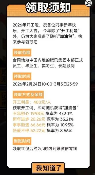 互联网大厂花式发开工红包:腾讯除每人400元外,还准备了随机“加油包”;百度为首次发放,最高可得2026元;还有京东、快手、淘天……