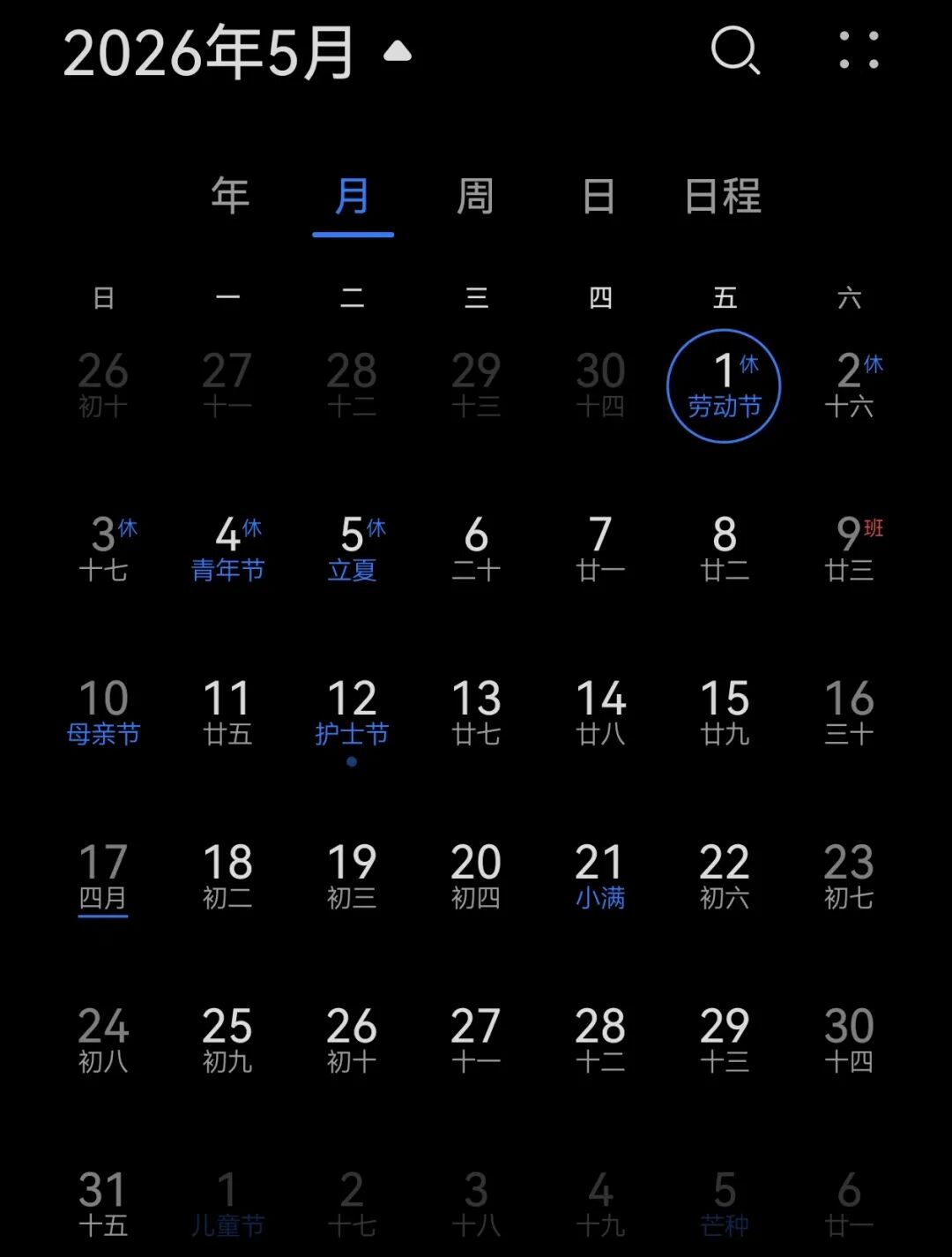 元旦:1月1日(周四)至3日(周六)放假调休,共3天。 春节:2月15日(周日)至23日(周一)放假调休,共9天。 清明节:4月4日(周六)至6日(周一)放假,共3天。 劳动节:5月1日(周五)至5日(周二)放假调休,共5天。 2月18日,"今年所有法定假日全与周末重合"冲上热搜,引发网友热议。 有网友发现,根据国务院办公厅发布的2026年节假日安排,春节、清明节、劳动节、端午节、中秋节、国庆节假日均与周末自然衔接。 | 31 | 24 初八 | 17 四月 | 10 母亲节 | 34 十七 | 26 初十 | 日 | | | --- | --- | --- | --- | --- | --- | --- | --- | | 儿童节 | 25 初九 | 18 | 11 | 41 青年节 | 27 | | 年 | | 4n | 26 | 19 | 护士节 0 | 5% 立夏 | 28 十二 | | | | ನೆಯ | 27 | 20 初四 | 13 | 40 | 29 | 三 | 周 | | 4 十九 | 28 | 21 | 14 | 7 甘一 | 30 十四 | 四 | | | 한 이 | 29 | 22 初 ...