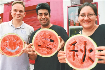 立秋已至,我国民间有吃西瓜"啃秋"的习俗。江苏大学来自俄罗斯、巴基斯坦、摩洛哥、尼日利亚、厄 瓜多尔等国的留学生来到江苏省镇江市金山街道杨家门社区,与居民一起吃西瓜"啃秋",体验我国传统 民俗。图为留学生展示在西瓜上刻出的笑脸和"立秋"字样。 (责编:郝孟佳、李昉) 石玉成摄(人民视觉) ...