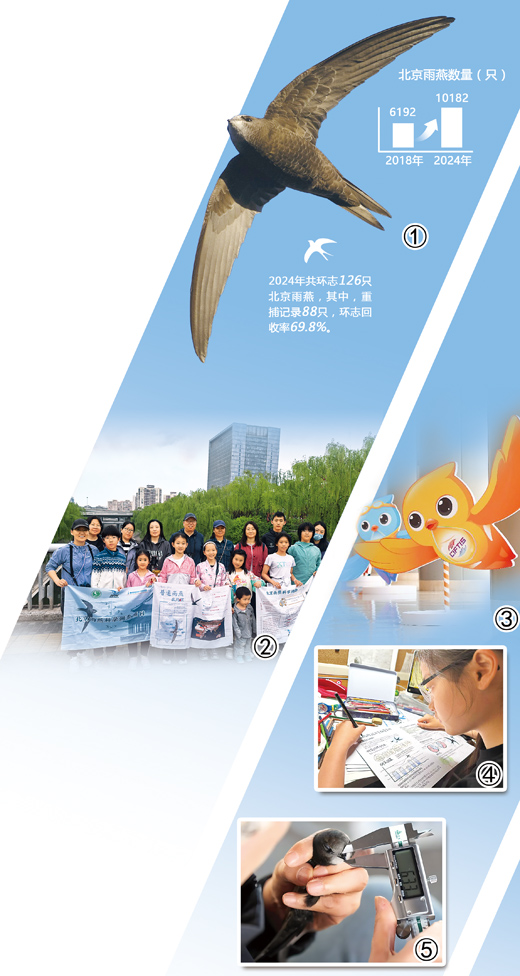 图①:北京雨燕。王晒宁摄 图②:北京雨燕科学调查项目天宁寺桥小组志愿者在调查结束后合影。受访者供图 图③:中国国际服务贸易交易会吉祥物"福燕"形象。新华社记者 陈钟昊摄 图④:北京四中学生任禹陶在制作北京雨燕研究图表。张丽婷摄 图⑤:北京市野生动物救护中心工作人员测量北京雨燕喙部长度。徐谭摄 潘旭涛制图 4月底的一天,北京北海公园五龙亭。下午6点多,金色夕阳细细地洒在白塔上,浅蓝色的天空中飘起几 缕晚霞。正是宜人的春末夏初时节,人们举起手机拍照,有人穿着汉服,有人对白塔比个心,还有人与 水面上飞驰而过的夜鹭或是绿头鸭合起了影。 人群中,有3个人盯着天空,嘴里碎碎念着:"今天还挺活跃""再过半小时差不多""估计能有200来 只"……天空中一种双翼形似镰刀的鸟,滑翔着发出"唧唧"叫,像在呼应着地面上仰头的人。 这3人,每周有3个傍晚准时出现于此。这里是北京雨燕科学调查北海公园五龙亭观测点。像这样的固定 观测点,在北京有整整40个。这一调查,每年从4月初持续到7月中下旬。 从2018年至今,北京雨燕科学调查已经进行到第八年,形成了国内首个城市雨燕动态数据库。一批批北 京市民成为志愿者,将时间、心力与热爱,献给这个名 ...