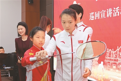 活动方供图 "长征,是理想信念的伟大远征,是不畏艰难、团结奋斗,从胜利走向胜利的光辉历程。今天,我 们接过历史的接力棒,以体育人的执着与坚韧,走好新时代长征路。"4月20日,站在江西省赣州市于都 县的中央红军长征出发纪念碑前,巴黎奥运冠军徐嘉余、黄雅琼和黄张嘉洋庄严肃立,献上深情致敬。 近日,"决胜巴黎 绽放奥运——奥运冠军面对面"巡回宣讲活动走进江西赣州。多名奥运冠军走进 赣南老区,讲述自己的拼搏故事,分享体育带来的力量和信念。与此同时,他们也在这片充满红色记忆 的土地上思考和感动着。 传递梦想 "小时候,我由于太过于内向,连和大人讲话都会满脸通红。但是,这一切都从我遇到羽毛球起, 有了不一样的变化。"在宣讲中,谈起自己与羽毛球的故事,巴黎奥运会羽毛球混合双打冠军黄雅琼 说,当初那个好胜心不强的小女孩,如今有着一股不认输的韧劲儿。 巴黎奥运会夺冠的时刻,黄雅琼躺倒在地。那是她打球以来,第一次以这样的方式庆祝胜利。"雅 思"组合从东京奥运会的失意,到巴黎奥运会东山再起,黄雅琼说,体育给了她不轻言放弃的勇气,也 让自己明白,什么叫梦想照进现实的力量。 黄雅琼(前右)指导学生羽毛球动作。 徐诗晓(前左)体验畲族竹 ...
