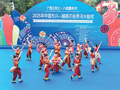 越南演职人员表演舞蹈《饭鼓》。 东兴当地民众正在了解相关特色商品。 谢 芳摄 中国东兴市和越南芒街市山水相连,民心相通。两地于2015年缔结为国际友好城市,并在文化、旅 游、经贸等领域开展广泛合作。此次界河大联欢活动,不仅是对中越传统友谊的一次深情回顾,更是对 未来合作与发展的美好展望。 据了解,除了界河大联欢活动外,两地还将联合举办中越商贸旅游博览会、中越跨境骑行、中越跨 境交流竞跑、中越界河对歌等系列活动。这些活动将进一步拓展两国在文化、旅游、经贸等领域的合作 空间,为构建具有战略意义的中越命运共同体注入新动力。 本报电(记者庞革平)4月13日,2025年中国东兴—越南芒街界河大联欢活动在中国广西东兴国门 景区国旗街举办。此次活动旨在庆祝中越建交75周年暨"中越人文交流年",进一步弘扬中越传统友谊, 深化双方人文交流与合作。北仑河畔,春意盎然,来自中越两国的艺术家与各界民众欢聚一堂,以艺术 为媒,共同谱写中越友谊的新篇章。 当天上午,一首由陈成意、曹婉然、利沙蔓、邓惠芳等人演唱的《壮乡美+壮族敬酒歌》正式拉开 了大联欢的序幕。这首充满民族风情的歌曲,不仅展现了壮族人民的热情好客,更传递了中越两国人民 之间 ...