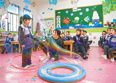 近日,在安徽省亳州市谯城区古城镇古城中心幼儿园芳玲幼儿分园,小朋友正在玩泡泡秀。 杨中勤摄(人民视觉) ...