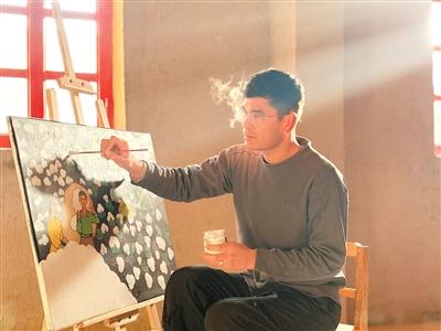 乃比江·阿布都热合曼。 在阿瓦提县刀郎文化(农民画)非遗传承中心展出的刀郎农民画作品。本版图片除标注外,均为本报记 者 孙 懿摄 乃比江在调制颜料。 在阿瓦提县刀郎故里景区游客接待中心,工作人员向游客介绍阿瓦提刀郎农民画。 刀郎农民画家在创作。 在阿瓦提县文化馆开展的"非遗进校园"活动中,乃比江指导阿瓦提县第八中学(鲁迅高中)学生画画。 受访者供图 冬日午后,新疆维吾尔自治区阿克苏地区阿瓦提县刀郎文化(农民画)非遗传承中心里,斜阳透过画室 的窗户铺洒进来。28岁的乃比江·阿布都热合曼手握画笔,笔尖蘸上一抹颜料,在画板上轻轻勾勒、涂 抹,一幅刀郎生活场景图,很快就有了鲜活的轮廓。 刀郎农民画始于20世纪70年代,起初只是农民们劳作间隙的消遣。农闲时,大家随手在木板、纸张甚至 自家墙壁上涂画,放牧的牛羊、欢腾的歌舞、热闹的婚礼,都是他们笔下的素材。后来,创作者们融合 维吾尔族地毯纹样、木雕、刺绣以及汉族年画、版画等元素,渐渐形成了自己的风格。这种画不讲究透 视效果,常常把日月星辰、春耕秋收都放进一幅画里;用色也格外热烈,大红、明黄、靛蓝,在黑色轮 廓的勾勒下,碰撞出满满的生命力。 对乃比江来说,刀郎农民画是刻在成 ...