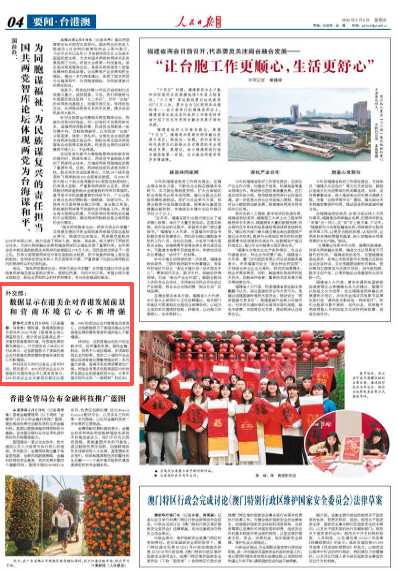 《人民日报海外版》(2026年02月06日 第 04 版) 新华社北京2月5日电(记者温馨、马卓言)据报道,香港美国商会日前发布2026年度《香港商业信心调 查报告》,显示受访在港美企进一步看好香港营商环境,对香港发展前景充满信心。外交部发言人林剑 5日对此表示,这些数据显示了美国在港企业对香港发展前景和营商环境的信心不断增强。 林剑在当日例行记者会上答问时说,报告显示,86%的受访企业认为香港作为国际商业中心具有竞争 力,92%的受访企业无意将总部迁出香港,94%的受访企业对香港法治有信心。这些数据显示了美国在 港企业对香港发展前景和营商环境的信心不断增强。 林剑说,当前香港由治及兴迈出新步伐,经济蓬勃发展,国际金融、航运、贸易中心地位稳固,多项国 际排名名列前茅。党的二十届四中全会提出促进香港长期繁荣稳定的一系列重大举措,香港未来发展前 景更加广阔。相信会有更多包括美国在内的世界各国企业到香港投资兴业,分享中国式现代化和"一国 两制"的红利。 责编:卢思宇、张振 ...