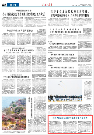 对于学生而言,这个学习APP让中文学习从"被动接受"变成了"主动探索"。高一学生达兰蓬·安法里说, 她几乎每天都用它练发音,不管读错哪个音节,它都能立刻指出,现在说中文自信多了。 北榄府教育局(中学部)局长沃拉波·辛哈拉介绍,目前,当地的25所中学中已有23所开设了中文课 程,覆盖率达92%,学习中文的学生人数持续攀升。引入中国AI技术辅助中文教学,既是响应泰国教育 部数字化外语教学的政策导向,更是贴合本地发展需求的务实之举。 从装饰满中国元素的沉浸式中文课堂,到AI赋能的个性化中文学习,中文教学已不再局限于传统课 堂,而是走上"云端"让人人可及。随着中国AI技术持续落地与推广,相信会有更多海外学子借助AI的力 量,走近中文、读懂中国。 (据新华社曼谷2月5日电 记者赵彩琳) 《人民日报海外版》(2026年02月06日 第 02 版) 走进离曼谷市区20余公里的泰国北榄府帖诗琳中学,一栋三层红色教学楼格外醒目,这栋楼以浓郁 的"中国红"为主色调,墙面绘有巨龙装饰,上面用中泰双语写着"北榄府帖诗琳中学汉语学习中心"。 帖诗琳中学校长隆素里·辛哈拉介绍,这栋特色建筑为学校近3000名学生提供沉浸式的中文教学。如 ...