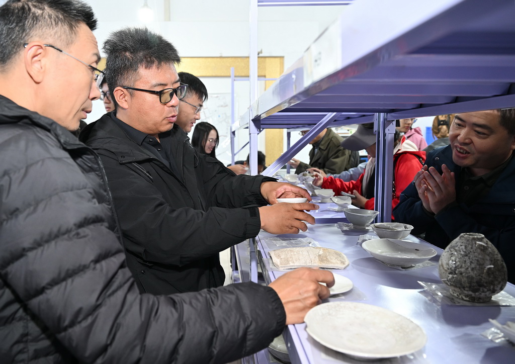 考古学家们在对苏峪口瓷窑址2025年度发掘区出土的一处石英加工遗迹进行考察(10月13日摄)。新华社记者 李贺 摄 在苏峪口瓷窑址考古队文物库房内摆放着大量出土的白瓷器物标本(10月13日摄)。新华社记者 李贺 摄 苏峪口瓷窑址考古队执行领队柴平平(左二)在考古队文物库房内向前来考察的专家介绍出土瓷器情况(10月13日摄)。新华社记者 李贺 摄 一位工作人员在苏峪口瓷窑址考古队文物库房内展示遗址出土的带有"官"字款的匣钵残片(10月13日摄)。新华社记者 李贺 摄 考古学家们在苏峪口瓷窑址考古队文物库房内对出土瓷器进行考察(10月13日摄)。新华社记者 李贺 摄 一位考古学家在苏峪口瓷窑址考古队文物库房内对新近出土的瓷器标本进行考察(10月13日摄)。新华社记者 李贺 摄 工作人员在苏峪口瓷窑址考古队文物库房内展示发掘出土的带有刻划花纹的瓷器残片(10月13日摄)。新华社记者 李贺 摄 考古学家们在苏峪口瓷窑址2024年度发掘区考察一处发掘出土的窑炉遗迹(10月13日摄)。新华社记者 李贺 摄 一位工作人员在苏峪口瓷窑址考古队文物库房内展示发掘出土的白瓷板瓦标本(10月13日摄)。新华社记者 李贺 摄 苏峪口 ...