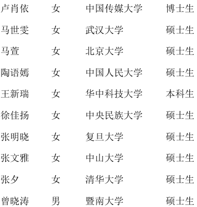 新闻学子奖:(10名) | 卢肖依 | 女 | 中国传媒大学 | 博士生 | | --- | --- | --- | --- | | 马世雯 | 女 | 武汉大学 | 硕士生 | | 马萱 | 女 | 北京大学 | 硕士生 | | 陶语嫣 | 女 | 中国人民大学 | 硕士生 | | 王新瑞 | 女 | 华中科技大学 | 本科生 | | 徐佳扬 | 女 | 中央民族大学 | 硕士生 | | 张明晓 | 女 | 复旦大学 | 硕士生 | | 张文雅 | 女 | 中山大学 | 硕士生 | | 张夕 | 女 | 清华大学 | 硕士生 | | 曾晓涛 | चेने | 暨南大学 | 硕士生 | 新闻教育良友奖:(1名) 范敬宜新闻教育奖评选组委会 2025年10月23日 新闻教育良师奖:(2名) 公示期间:接受单位或个人对获奖人的情况反映。反映人应据实名,反映情况真实具体。 电子邮箱:fjyprize@tsinghua.edu.cn 公示期:2025年 10月23日~2024年 10月 30日 联系电话:15201105730 ...