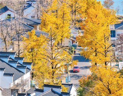 11月25日,浙江省湖州市长兴县小浦镇十里银杏长廊,金黄色的银杏林与古宅民宿、道路交相辉映,构 成美丽的乡村画卷。 陈海伟摄(人民图片) ...