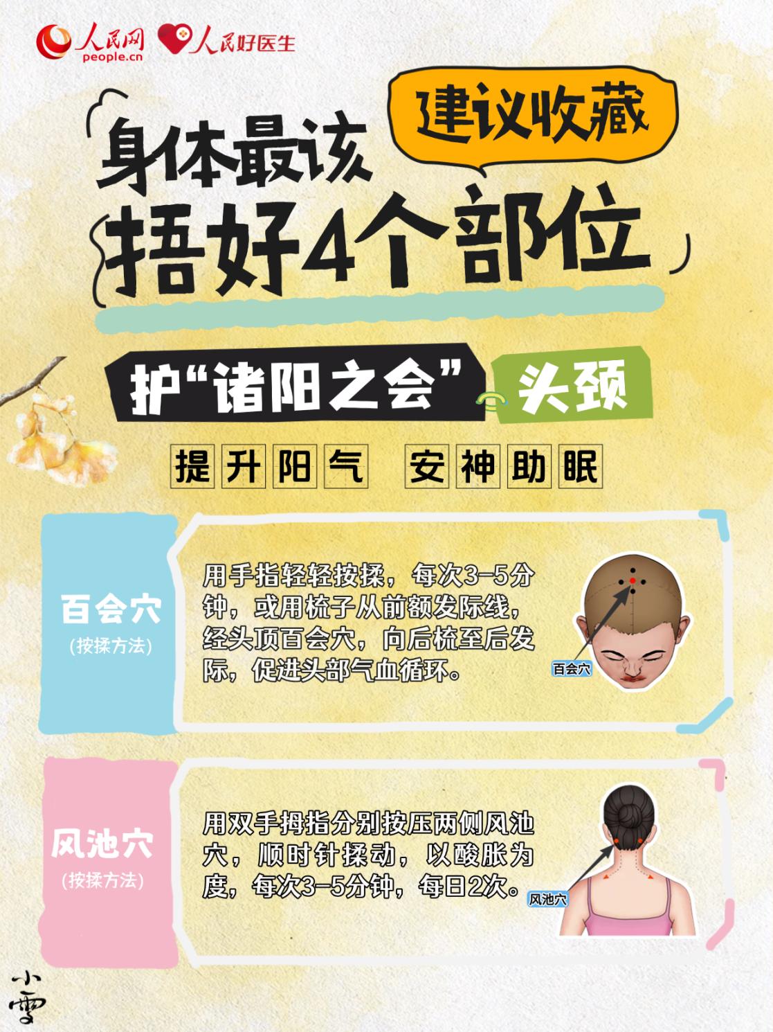 小雪节气的到来意味着天气越来越寒冷,阳气潜藏,阴气旺盛。人体的阴阳消长代谢处于相对缓慢的水平,人体气血亦随"冬藏"之气而潜藏。此时身体 哪些部位需要注意防寒保暖?又该如何做到固护阳气,未病先防? © | RHE生 建议收藏 体最近 *好41 于"宗气之海"】胸背 振 奋 阳 气 驱 散 风 寒 開掛指或食指指順發経按医師 和前 7 命穴。以酸账但不疼痛为宜。 (按察方法 顺时针方向按紧。每次3-5分 钟,两侧穴位交替进行。 以食指或中指指腹披催大權 大 : : 7 穴,顺时、逆时针各画圈探 按2分钟,紧按时力度曲轻渐 (按探方法) 重, 以局部微媒、酸服为度。 0人民好医生 建议收藏 财本最近 FIFE : 4-41 养"五脏之本"】腰腹 培 元 补 气 补 肾 强 腰 先将掌心搓热,然后吸美元穴 为中心,顺时针、逆时针接 法元不 摩。每次3-5分钟。以局部发 (按揉方法) 戏、酸脂为度。 关元穴 双手掌放在腎命穴上。上下来 =行示 回營器,每次3-5分钟。使局 (按探方法) 部发展。放公理品。 肾前穴 0 | 私好医生 E EXIK HO 1不可以7 2044 国"经气之根"】足踝 补肾益精 壮阳强 腰 周 ...