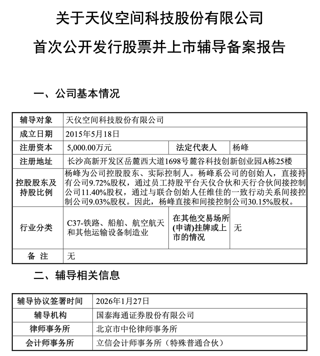 2月2日,头部商业卫星企业天仪空间科技股份有限公司(以下简称"天仪空间")在湖南证监局完成IPO辅导备案,辅导机构为国泰海通证券股份有限公 司,律师事务所为北京市中伦律师事务所,会计师事务所为立信会计师事务所(特殊普通合伙)。 天仪空间更为人熟知的企业名称是天仪研究院,是中国领先的SAR卫星星座运营商,专注于SAR星座建设和SAR卫星数据服务。2025年公司完成股份制改 造,并于12月将企业名称由"长沙天仪空间科技研究院有限公司"变更为"天仪空间科技股份有限公司"。这被业界普遍解读为其对接资本市场、谋求上市的 关键一步。 天仪空间成立于2015年5月18日,法定代表人是杨峰。杨峰为公司控股股东、实际控制人。杨峰系公司的创始人,直接持有公司9.72%股权,通过员工持 股平台天仪合伙和天行合伙间接控制公司11.40%股权,通过与联合创始人任维佳的一致行动关系间接控制公司9.03%股权。因此,杨峰直接和间接控制公 司30.15%股权。 天仪空间核心团队成员主要来自航天科技、航天科工等航天单位,同时还有来自国际的航天人才,累计参与了国内外近百个航天型号(卫星、飞船、空间 站)的研制任务。 杨峰毕业于北京航空航天大学, ...