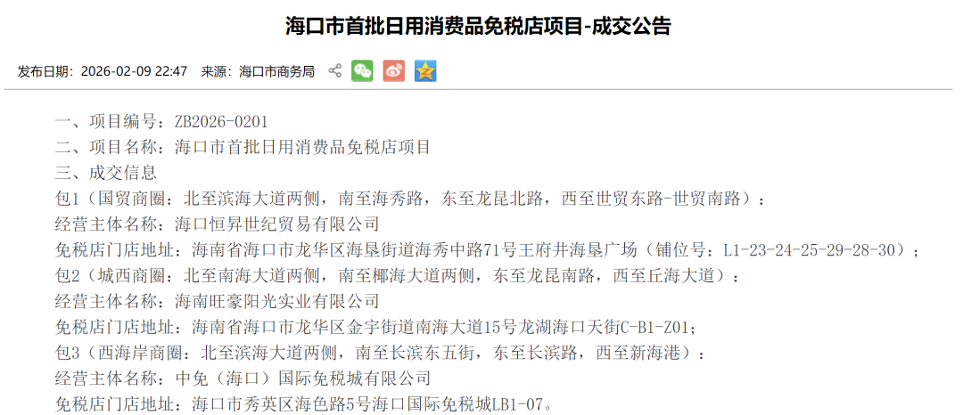 2月9日晚间,海口市商务局发布《海口市首批日用消费品免税店项目-成交公告》。其中,国贸商圈的日用消费品免税店经营主体为海口恒昇世纪贸易有 限公司,门店地址位于龙华区海垦街道海秀中路71号王府井海垦广场;城西商圈的日用消费品免税店经营主体为海南旺豪阳光实业有限公司,门店地址位 于龙华区金宇街道南海大道15号龙湖海口天街;西海岸商圈的日用消费品免税店经营主体为中免(海口)国际免税城有限公司,门店地址位于秀英区海色 路5号海口国际免税城。 同日晚间,三亚市商务局发布《关于三亚市首批日用消费品免税店项目竞争性谈判评审结果的公告》。当中提到,经评审,确定珠免集团(海南)免税品 有限公司为三亚市首批日用消费品免税店的"零关税"日用消费品经营主体,日用消费品免税店地址:三亚市天涯区三亚湾路8号三亚湾壹号【L1】层【L1- 11、L1-11-1、L1-12、L1-12-1】号铺位。 海南首批5家日用消费品免税店经营主体和具体门店地址揭晓。 洋浦经济开发区投资促进局发布了《儋州市岛内居民日用消费品免税夏日广场店经营主体遴选项目成交结果公告》。成交信息显示,供应商(成交单位) 名称为儋州夏日百货有限公司。 | 标题:儋州市岛内居 ...