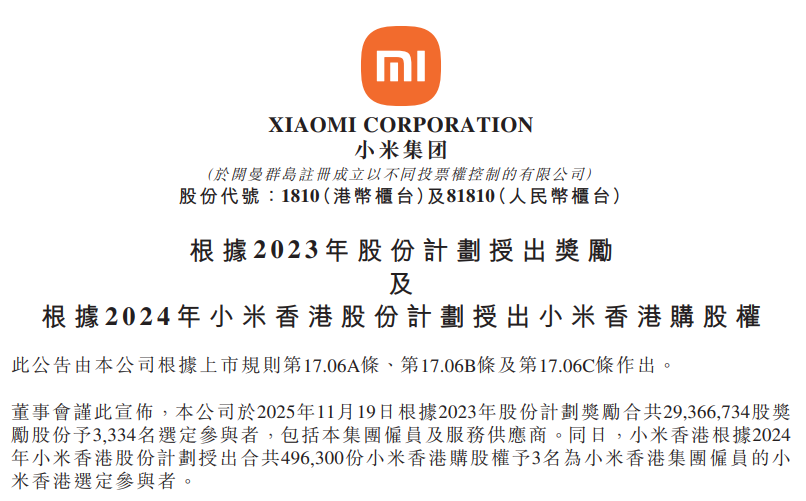激励员工与供应商,强化人才与供应链稳定。 小米集团-W(01810.HK)于11月19日晚间发布公告,宣布根据2023年股份计划向3334名选定参与者奖励合共2936.67 万股奖励股份,约占公司已发行股本的0.11%。若以小米11月19日收盘价每股38.82港元测算,本次授予股份的总价 值约11.4亿港元。 与此同时,小米还根据2024年股份计划,向3名小米香港集团雇员授出合共49.63万份小米香港购股权。 股份奖励方面,覆盖范围不仅包括集团员工,还涉及供应商,人均获授股份价值约34.2万港元。奖励股票于2025年 11月20日至2034年11月20日期间归属。 根据公告,小米股权激励池尚有5.77亿股可供未来授出,其中计划授权限额和服务供应商分项限额,分别有5.27亿 股及0.5亿股。 购股权部分,3名雇员人均购股权数量达16.54万份,该计划将于2026年11月20日至2030年8月20日期间归属。 当前,股权激励已成为科技企业吸引和保留人才的标配工具。小米正推进智能汽车、AIoT等需长期投入的硬核科 技领域,这类业务既需要稳定的内部人才团队,也离不开供应链的紧密配合。股份激励无疑将激发基层员工与合 作 ...