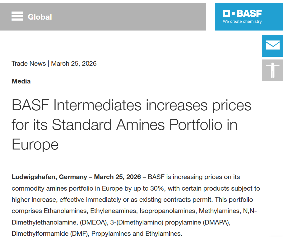 当地时间周三,全球化工巨头巴斯夫(BASF)宣布鉴于美以伊战争导致的成本上升,公司将提高更多产品的价格。 许的情况下实施。 巴斯夫宣布, 将在 欧洲地区 对旗下 基础胺类产品组合 提价 ,涨幅最高可达30%,部分产品涨幅可能更高。该调价措施即刻生效,或在现有合同条款允 此次提价涉及的产品包括:乙醇胺(Ethanolamines)、乙烯胺(Ethyleneamines)、异丙醇胺(Isopropanolamines)、甲胺(Methylamines)、N,N-二甲基 乙醇胺(DMEOA)、3-(二甲基氨基)丙胺(DMAPA)、二甲基甲酰胺(DMF)、丙胺(Propylamines)以及乙胺(Ethylamines)。 这些产品都是所谓的通用中间体原料,虽然名字看上去很抽象,但实际上是 电子、农化、医药等产业链工业配方中不可或缺的关键材料 。 举例来说,乙烯胺是环氧树脂固化剂的重要原料之一, 而环氧树脂则是 风电叶片复合材料 与 PCB电子板基材 的关键基础材料。 二甲基甲酰胺是生产PVDF(聚偏氟乙烯)的关键溶剂, 而PVDF又是 锂电池正极材料 的重要粘结剂之一。 这也是开战近一个月来,巴斯夫在官网发布的第五 ...