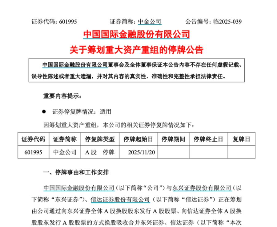 此次"三合一"整合,是2024年新"国九条"发布后又一例大型券商深度整合案例。 21世纪经济报道记者崔文静实习生张长荣北京报道 市场关注已久的中金公司合并消息终于落地,但此番合并对象并非此前市场猜测的银河证券,而是东兴证券与信达证券。 11月19日晚,三家券商同步发布《关于筹划重大资产重组的停牌公告》,揭晓了这宗由中金公司通过换股方式吸收合并后两者 的重磅方案,自11月20日起,三家券商将正式停牌,预计停牌时间不超过25个交易日。 | 证券代码 证券简称 停复牌类型 停牌起始日 停牌期间 | | | --- | --- | | 601995 中金公司 A 股 停牌 | 2025/11/20 | "三合一"大并购 根据中金公司、东兴证券、信达证券公告,此次合并由中金公司牵头,中金公司通过向东兴证券全体A股换股股东发行A股股 票、向信达证券全体A股换股股东发行A股股票的方式,换股吸收合并东兴证券、信达证券。 中金公司合并对象并非此前市场猜测已久的银河证券,而是东兴证券与信达证券,这虽看似意外,实则是另一盘券商整合大棋 的重要落子。 随着三大AMC相继划入中央汇金旗下,东兴证券与信达证券也摇身成为中央汇金旗下券商。 ...