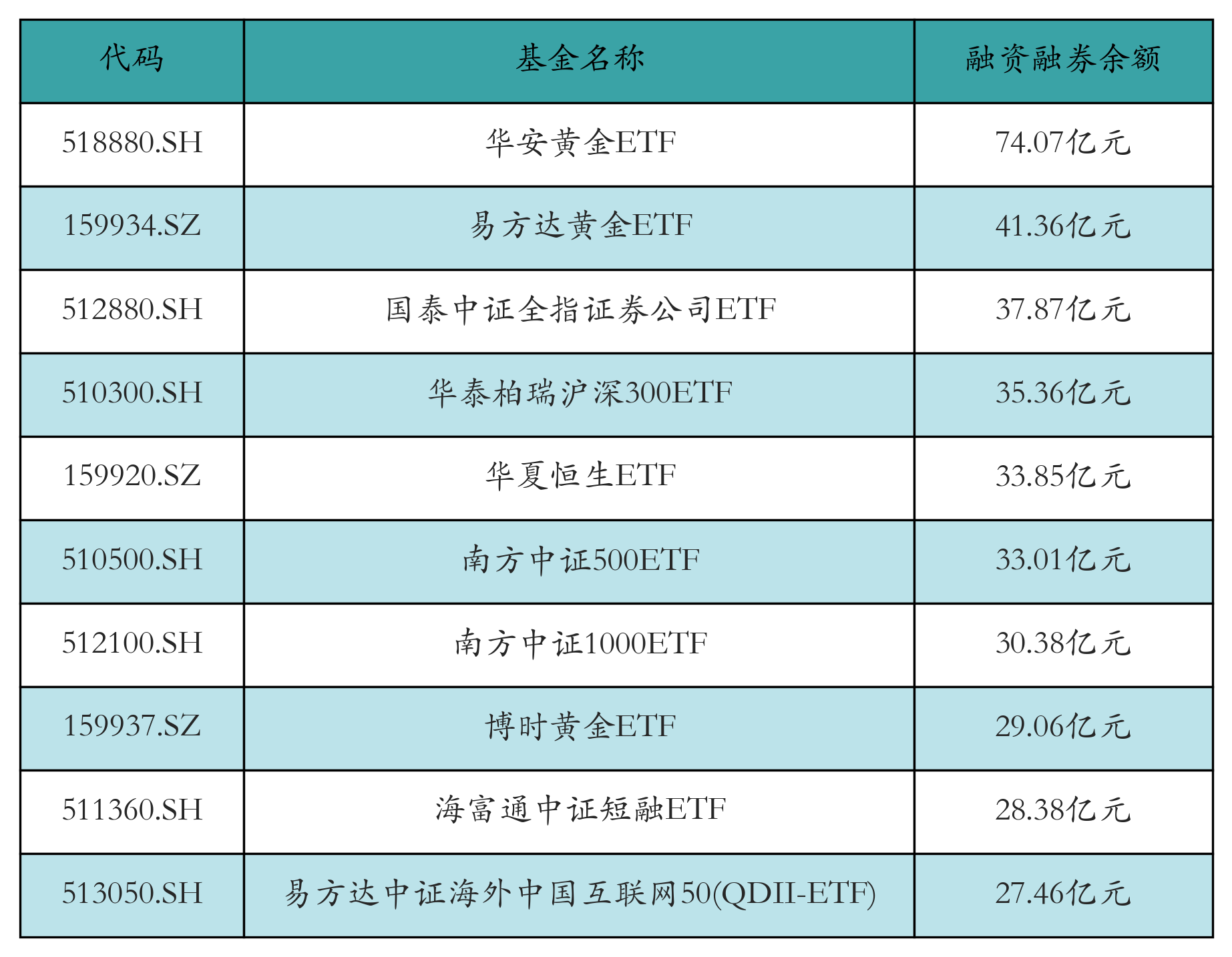 市场概况 | 代码 | 基金名称 | | --- | --- | | 511360.SH | 海富通中证短融ETF | | 513130.SH | 恒生科技 | | 511380.SH | 博时可转债ETF | | 518880.SH | 华安黄金ETF | | 513090.SH | 易方达中证香港证券投资主题(消 | | 513180.SH | 华夏恒生科技ETF(QDI | | 159915.SZ | 易方达创业板ETF | | 513050.SH | 易方达中证海外中国互联网50(( | | 513330.SH | 华夏恒生互联网科技业ETF | | 512880.SH | 国泰中证全指证券公司E | 2月13日两市ETF两融余额为1158.64亿元,较前一交易日减少94.83亿元。其中融资余额为1083.67亿元,较前一交易日减少94.54亿元;融券余额为74.97亿 元,较前一交易日减少2962.5万元。 分市场来看,沪市ETF两融余额为809.22亿元,较前一交易日减少86.62亿元。其中融资余额为743.54亿元,较前一交易日减少86.57亿元;融券余额为65.68 亿元,较前一交易日减少41 ...