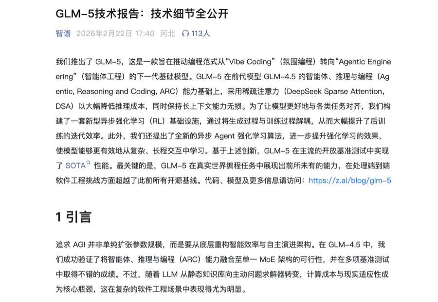 21世纪经济报道新质生产力研究院综合报道 早上好,新的一天又开始了。在过去的24小时内,科技行业发生了哪些有意思的事情?来跟21tech一起看看吧。 【巨头风向标】 2月23日,问界汽车官微发布《关于广东省惠州市车辆起火的说明》。其中称,2026年2月21日,一辆问界M9在广东省惠州市附 近起火,事件未造成人员伤亡。经初步调查,车辆三电系统状态正常,且未见车辆其它自身异常,判断事件非车辆自身原因导 致。说明称,将密切配合有关部门完成后续调查并积极协助用户处理后续事宜。请大家不信谣,不传谣。 问界通报"广东惠州车辆起火事件" 2月22日,智谱发布技术报告,全面解读GLM-5的技术细节。据称,GLM-5是一款旨在推动编程范式从"Vibe Coding"(氛围编 程)转向"Agentic Engineering"(智能体工程)的下一代基础模型。GLM-5 在前代模型 GLM-4.5 的智能体、推理与编程 (Agentic, Reasoning and Coding, ARC)能力基础上,采用稀疏注意力(DeepSeek Sparse Attention,DSA)以大幅降低推理成 本,同时保持长上下文能力无损。为了让 ...