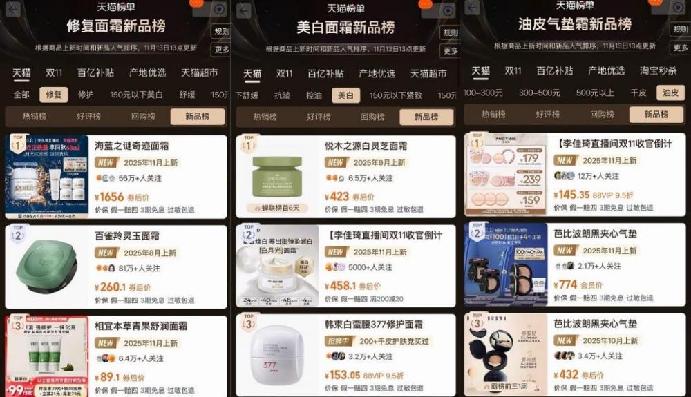 "史上最长"双11收官,不少品牌新品迎来爆发。 "今年双11,消费者的护肤选择,呈现出鲜明的精准化特征。"李佳琦直播间的美妆选品负责人表示。 消费者偏好从"大套组"向"大单品"转变,更倾向于自主搭配。双11恰逢季节转换,消费者的护肤诉求也向"滋润修护"倾斜,面霜、精华等强功 效产品热卖。 值得一提的是,今年双11,美妆、消电、母婴、宠物等各品类的新品在李佳琦直播间完成从亮相到爆款的跨越。不少新品更是冲上天猫新品榜 单。 (图说:李佳琦直播间走出的新品冲上天猫新品榜单) "今年新推一款油敷面膜,双11前首发。"自然堂品牌营销总经理钟卫表示,其针对秋冬时期的上妆不服帖,卡粉、显纹等问题,售价为99 元/12片。 市面上销量较好的油膜,单片价格基本都在15元左右。钟卫介绍,"自然堂与李佳琦团队将价格定在10元以内,给消费者高品质、性价比的选 择。" 据李佳琦直播间数据,双11首日,自然堂油敷面膜就售出超10万件。 除此之外,自然堂小紫瓶精华、极地精华露等口碑产品,也在李佳琦直播间热卖。"自然堂在李佳琦直播间的GMV同比增幅近30%。"钟卫透 露。 钟卫表示,自然堂深度参与了这两个综艺节目,还做了许多后期二创,核心产 ...