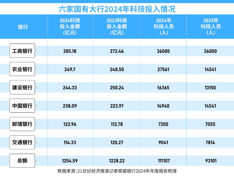 Core Insights - The banking industry is entering a new phase of digital finance development driven by AI applications, which are reshaping competitive dynamics and enabling smaller banks to gain advantages through innovation [1][2]. Group 1: Technology Investment and Governance - In 2024, the total technology investment by six major state-owned banks exceeded 120 billion yuan, marking a year-on-year increase of 2.15%, with a total of over 110,000 technology personnel, up 19.34% from the previous year [2][3]. - The technology investment of these six banks accounts for over 50% of the total technology investment across 59 banks that disclosed relevant data, which exceeded 200 billion yuan in 2024 [3]. - Some banks, such as China Construction Bank and Ping An Bank, reported a decrease in technology investment, with declines of 2.36% and 20.07% respectively, indicating a potential slowdown in technology spending [4]. Group 2: AI Integration and Talent Development - Banks are increasingly focusing on optimizing technology governance structures and enhancing resource management, with a particular emphasis on integrating AI into various business lines [5][6]. - The rise of AI has led to a significant increase in the proportion of technology personnel within banks, with all 11 major banks reporting growth in this area compared to 2023 [8][9]. - Banks are adopting dual pathways for cultivating composite talents, including targeted recruitment and internal mechanisms to foster collaboration between technology and business functions [10][11]. Group 3: Strategic Initiatives and Innovations - Several banks, including Industrial and Commercial Bank of China and Minsheng Bank, are launching strategic initiatives to deepen their digital transformation and AI capabilities [6][7]. - The focus is shifting from merely integrating technology to co-creating business and technology solutions, as highlighted by the emphasis on business involvement in AI model development [12].