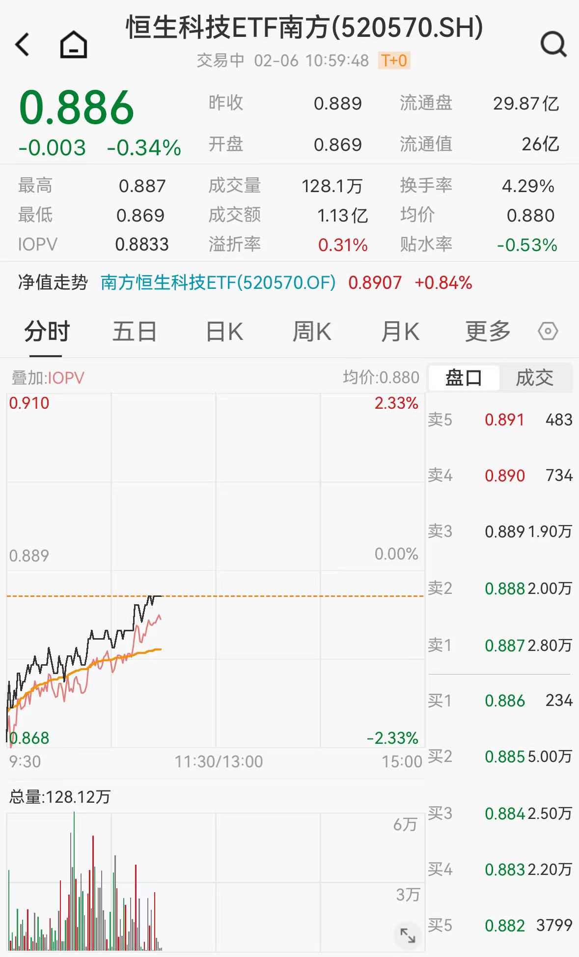 恒生科技ETF南方 (520570) 紧密跟踪恒生科技指数,覆盖港股上市的30家最大且流动性最高的科技企业,是反映港股科技板块走势的核心工具。当前指数估 值处于历史相对低位,南向资金持续流入,叠加AI商业化加速、政策环境边际改善,指数中长期修复空间值得期待。 2月6日,港股低开,恒生科技指数一度跌超2%,随后跌幅收窄。截至10:59,恒生科技指数报5374.24。南方基金旗下恒生科技ETF南方(520570)当日盘中 跟随指数震荡上行,盘中成交活跃,成交金额约1.13亿元万元,换手率约4.29%。 这波港股调整中,资金逆势加仓,该ETF2月4日获净申购约7785万元,在跨境ETF中净流入排名第17/212,近5日累计净流入约7875万元,资金呈现"越跌越 买"特征,显示中长期资金对港股科技板块的配置意愿较强。 消息面上,券商普遍认为港股科技板块当前估值处于近五年低位,恒生科技指数与创业板指收益差处于历史高位,安全边际较高,同时,港股科技板块在 AI应用端和商业化环节占据核心位置,盈利增长确定性较强,叠加海外弱美元和人民币企稳预期南向资金与外资回流有望共同支撑板块估值修复。南向资 金方面,2月4日港股通净买入约 ...