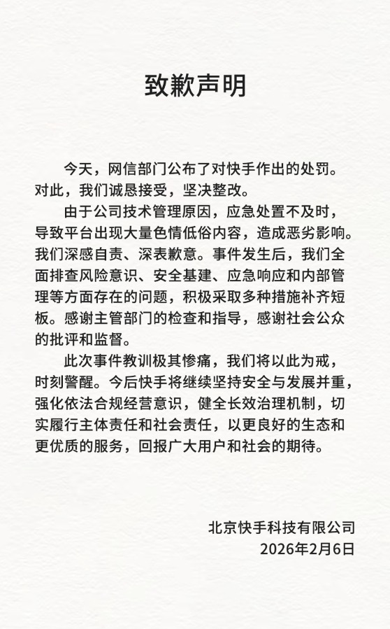 当天,快手回应称:"对此,我们诚恳接受,坚决整改。由于公司技术管理原因,应急处置不及时导致 平台出现大量色情低俗内容,造成恶劣影响。我们深感自责、深表歉意。事件发生后,我们全面排查风 险意识、安全基建、应急响应和内部管理等方面存在的问题,积极采取多种措施补齐短板。感谢主管部 门的检查和指导,感谢社会公众的批评和监督。" 2月6日,北京市互联网信息办公室依据《中华人民共和国网络安全法》《中华人民共和国行政处罚法》 等法律法规,对北京快手科技有限公司处警告、1.191亿元人民币罚款处罚,同时责令其限期改正、依 法依约处置账号、从严处理责任人。 (文章来源:21世纪经济报道) ...