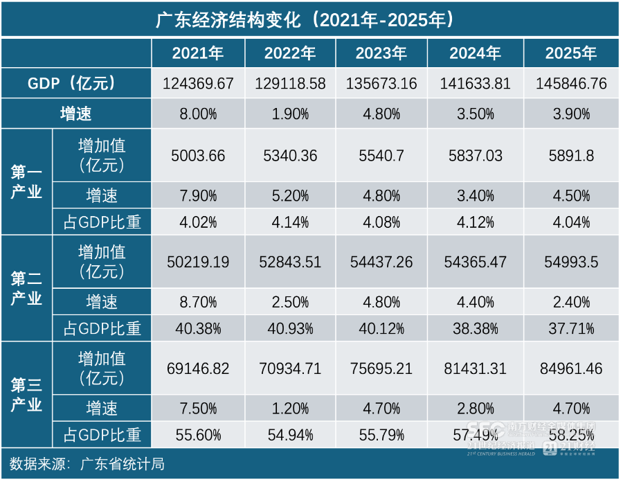 2026年春节假期进入尾声,"马不停蹄"的经济第一大省即将迎来节后首场盛会。 2月24日,节后返工第一天,广东全省高质量发展大会将于广州举行。 这也是自2023年起,广东连续第4年在开工首日举办新春第一会,主题始终聚焦高质量发展,为全年经济发展打响持续争先 的"发令枪"。 南方财经记者获悉,2026年广东全省高质量发展大会的主题将聚焦"制造业与服务业协同发展"。从2023年发出"再造一个新广 东"的呼号,到2024年明确"推动产业和科技互促双强",再到2025年聚焦"建设现代化产业体系",今年广东将服务业提上与制造 业并重的关键位置。 "广东制造业正处于高端化、智能化、绿色化转型的关键阶段,对服务赋能的需求空前迫切。"北京师范大学政府管理研究院副 院长、中国商业经济学会副会长宋向清向南方财经记者表示,"当前是推动先进制造业与现代服务业'两业'融合最为关键的窗口 期,推动融合恰逢其时。" 从一组数据上也可以直观看出这一趋势:2021年—2025年,广东第三产业增加值占全省GDP比重从55.60%整体上升至58.25%。 2025年,广东全省服务业增加值同比增长4.7%,增速同比提高1.9个百分点,跑赢GDP增速 ...